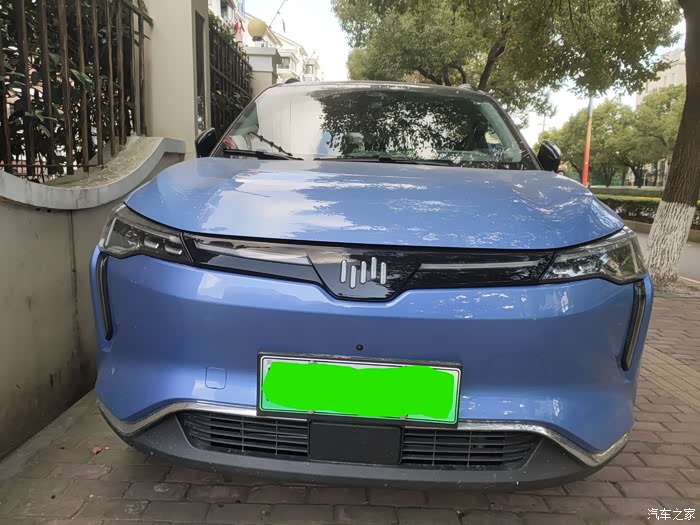 车头威马的标志漂亮,而且具有功能性,充电的时候显示电量,一条竖线代表大约20%的电量,不充电的时候,在夜晚是亮着的,还会显示五彩跳动,隔一会闪一下,隔一会闪一下,像呼吸一般,让人感觉这是一台有生命的车子。