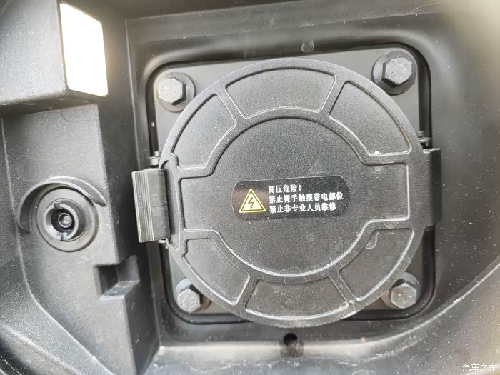 直流充电口在右前方,内外警告文字显眼。