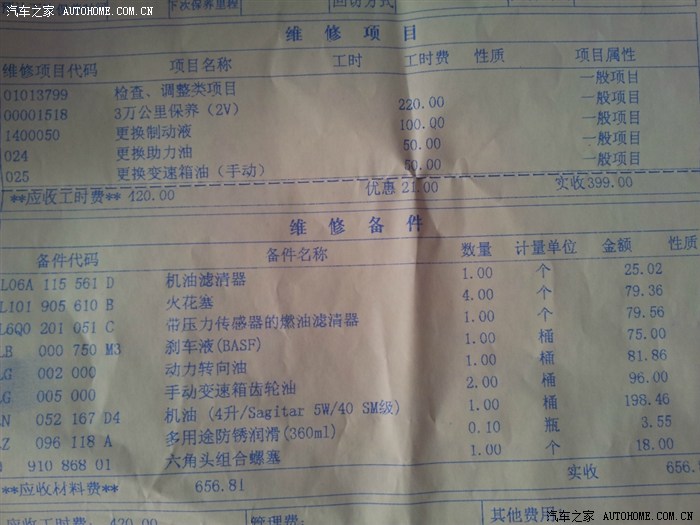 不知为什么材料费会精确到小数点后两位。材料费共计656.81元;工时费420元,折扣后实收399元。总计费用1056元------人民币,心疼啊!!!!!!!