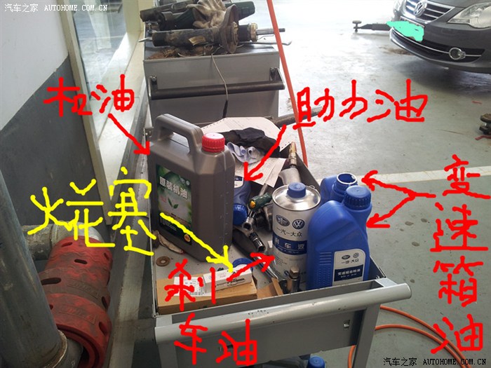准备更换的四种油,其中变速箱油需要两桶。拍照时没注意助力油倒下了。