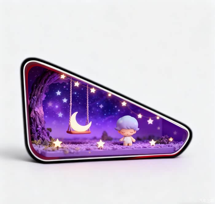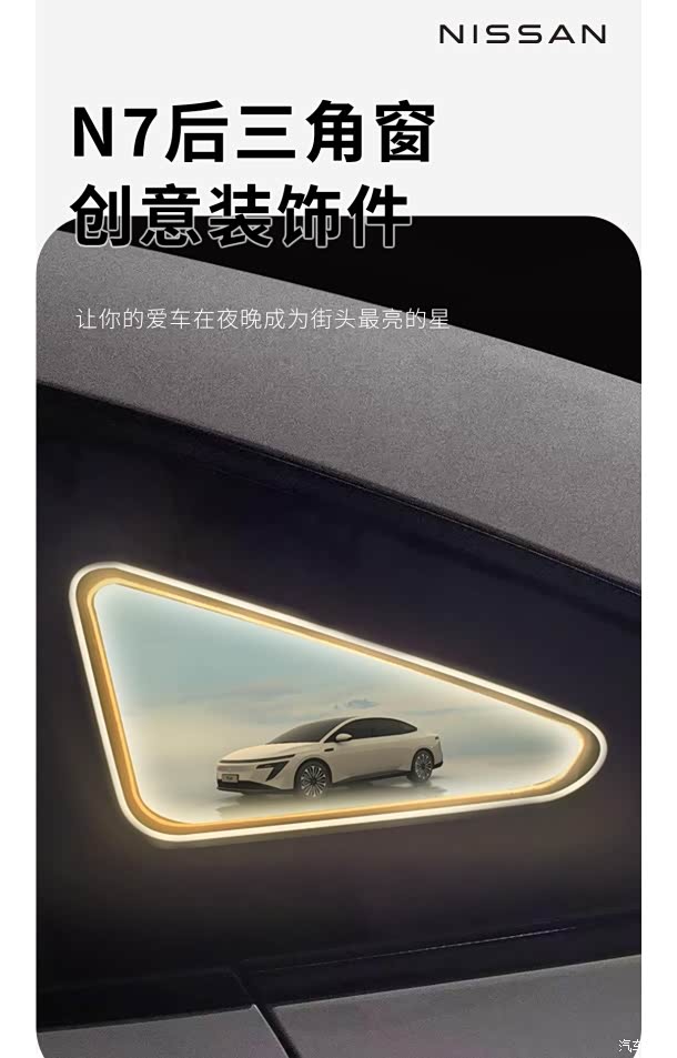 我的想法是给日产N7的后三角窗配一套泡泡玛特经典场景微观贴纸,再搭上车商城里专为它定制的后三角装饰件。这组合像给潮玩搭了个专属小舞台,稳稳托住每款主题贴的细节。想换风格随时切,N7的后三角窗眨眼就能切换新的场景,方寸之间直接装下一整个萌趣小宇宙。再搭配装饰件自带的灯光调节,白天开柔和白光,贴纸里的潮玩细节清透得像刚拆的盲盒;夜晚调暖黄流光,灯光裹着贴纸漫出车外,晕出层童话柔光。往停车场一停,这后三角窗活脱脱是个发光的潮玩盲盒,在车流里一眼就能认出来。