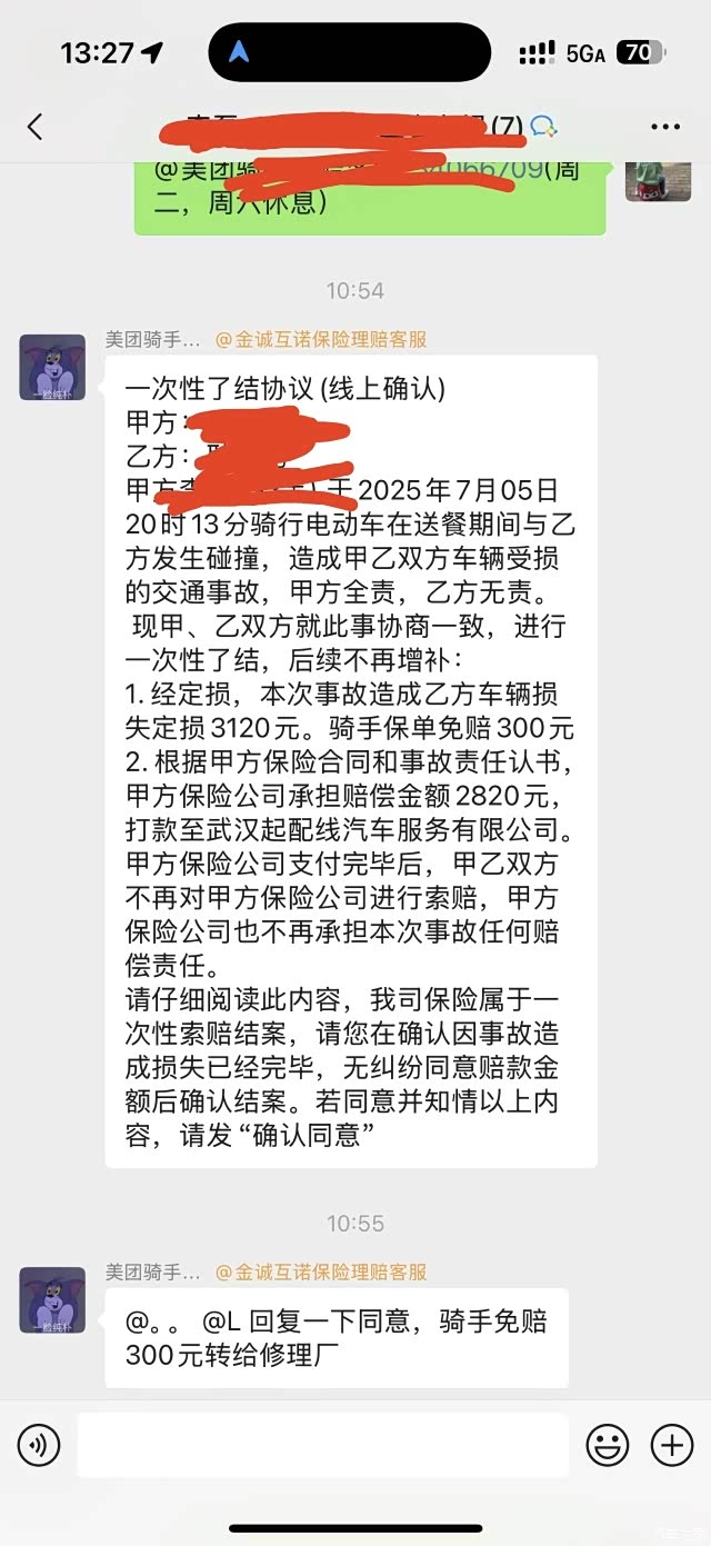 还好他们美团给他们骑手买了保险,然后经过交警,是呀,他找了他的这个美团的这个保险公司有300块钱的免赔额,总共3000多块钱,然后免赔了300,现在那300的骑手自己掏,然后剩下2800,保险公司直接打到我们这边账上了,然后这300骑手就不愿意掏,但是看他是送外卖的,也比较辛苦,也就算了,吃一堑长一智,要在路口还是要慢点开。