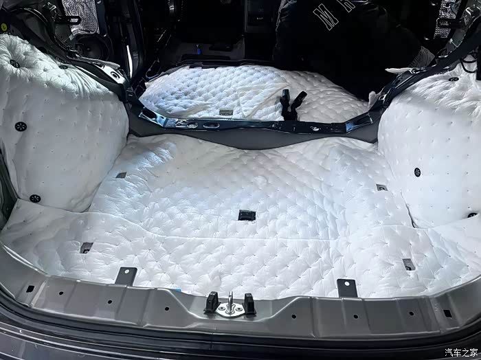 后备箱也包的很严实。后备箱有时候做完隔音是要试下车的,有时候他这个后背像那个尾门上那个两个橡皮胶垫。松动的话可能会有一定的响动,所以要来回调一下。