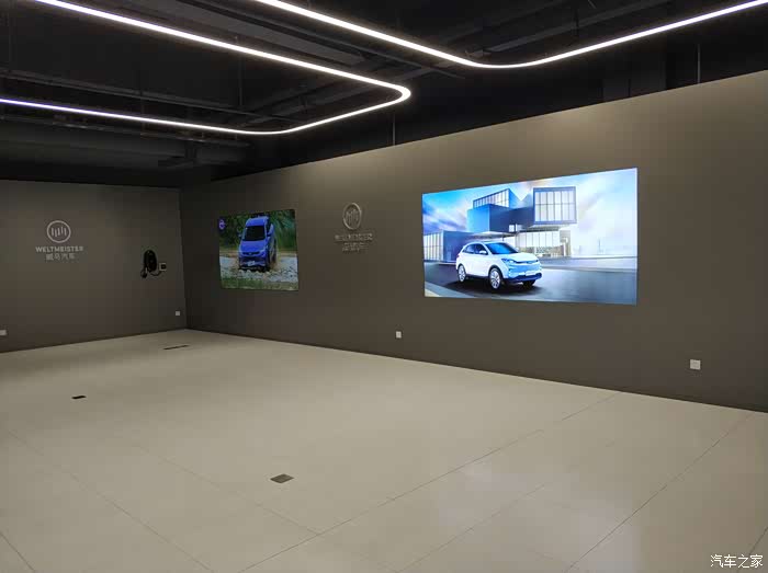 驾车进入最左侧的维修接待等候区,车道左侧分别是车辆临时停放区和维修接待区。临停区大概可供四辆车同时停放,墙面上有两个威马专用慢充桩。