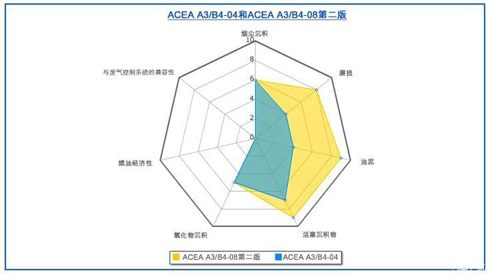 借用一张欧洲的ACEA认证标准的图,可以看到A3/B4从以上几个方面考虑,达到的性能指标(数字越大越好)。