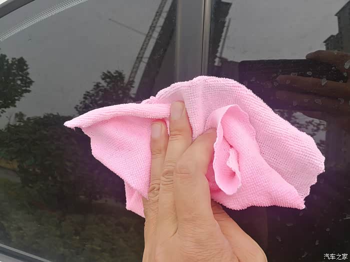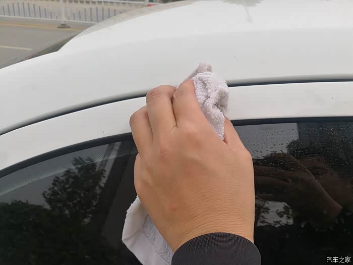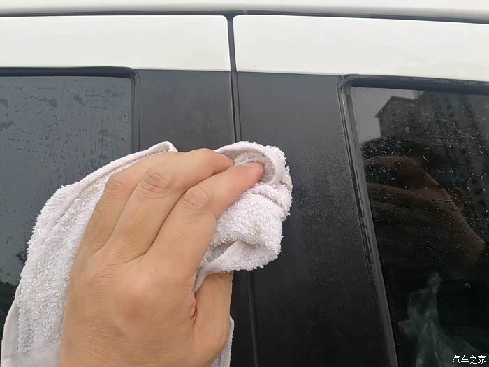 拿出湿毛巾对上车窗边框进行擦拭,擦掉上车窗的浮尘。