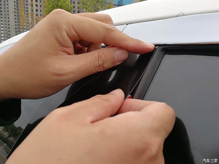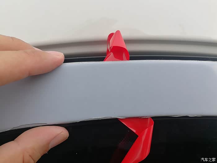 后车窗亮条上边粘贴完成,贴合还是比较完美的。