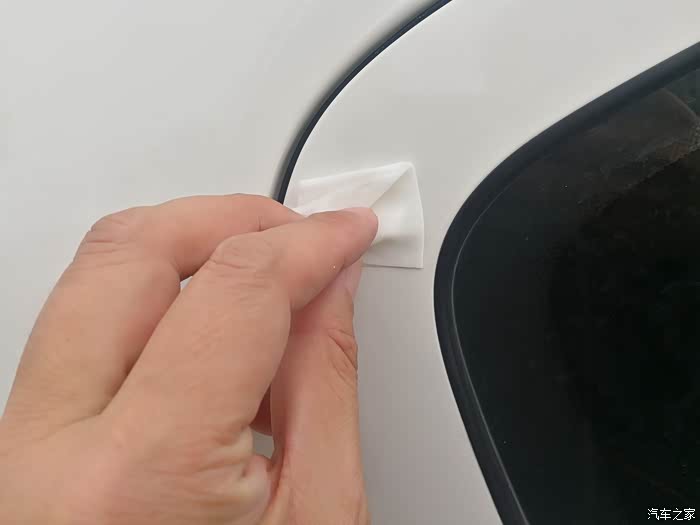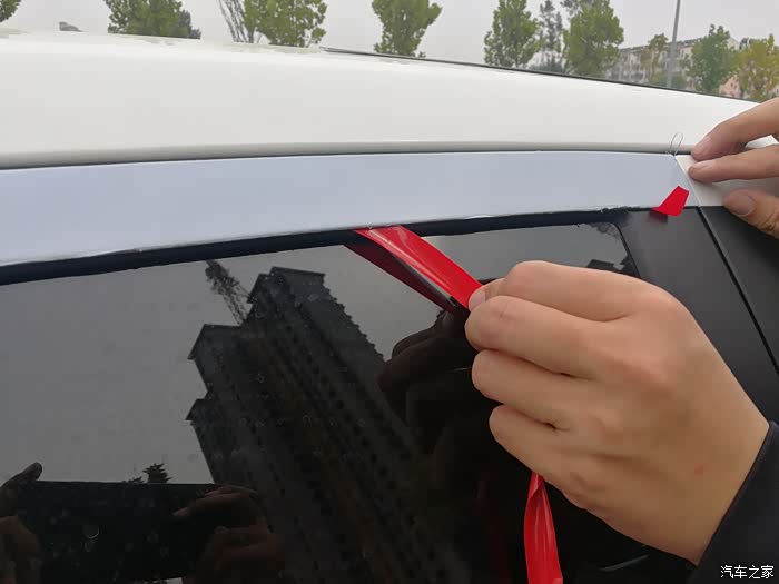 撕开3M胶。先固定车窗亮条的两个端点,再一点点的沿一个端点粘贴。