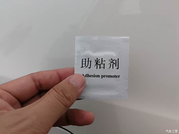 拿出赠送的助粘剂。助粘剂可以更好的让车窗亮条内的3M胶牢固的粘在上车窗上。
