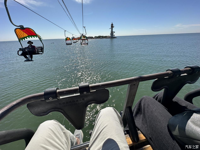 缆车为双人半封闭式,所以拍照之余更要看好手机和背包,掉下去就洗白白了。坐在缆车上俯瞰渤海湾,海风吹拂,海浪翻涌,沙滩上人头攒动,既观赏了海滨风光,又领略了海鸥飞舞,让人轻松惬意、乐而忘返。
