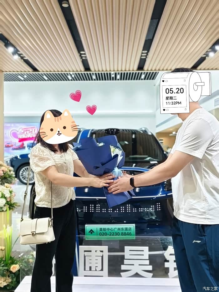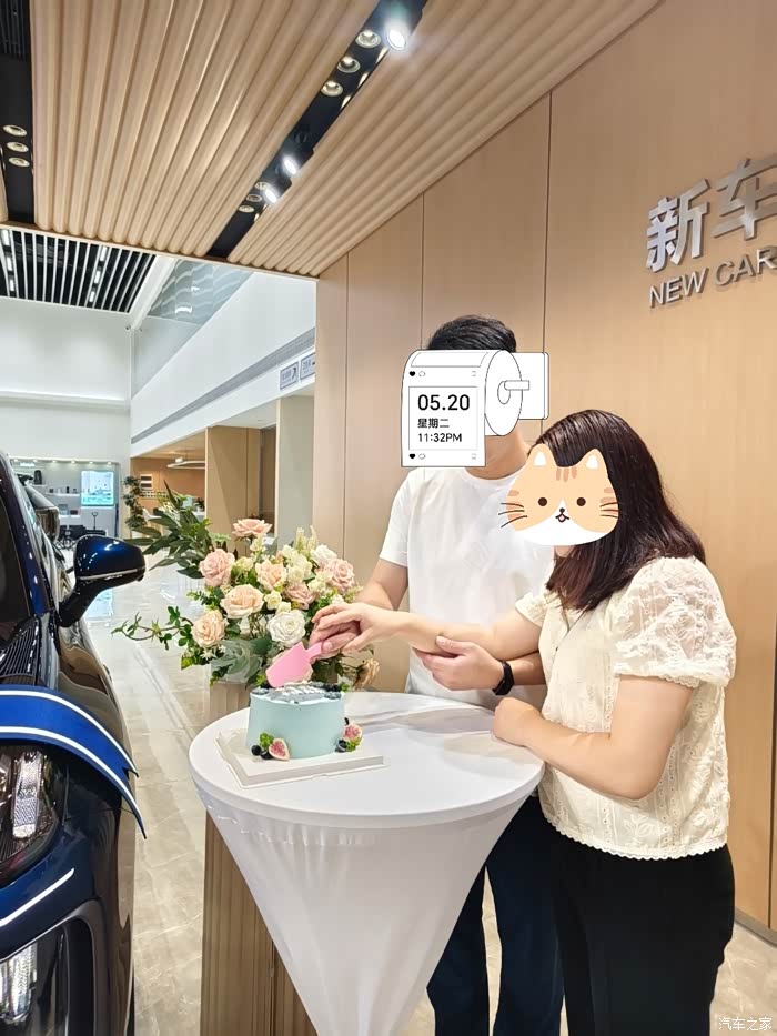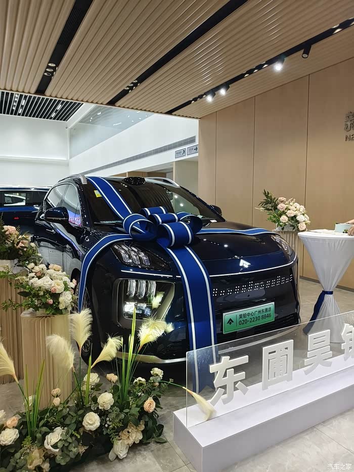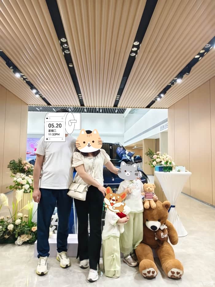 各种手续办完,当时就是最激动人心的提车环节,提前17号下午提车,这里借用下群友的黄历,没想到17号是这么好的日子,当天又是下雨,所谓“雨为水,水为财”遇着有财。当走进昊铂东圃店就看到我的车摆在交付中心,旁边还精心准备了蛋糕,鲜花,玩偶,仪式感满满,经过店员对车辆的功能讲解以及账号绑定,当天非常荣幸昊铂东圃店的张总为我亲自交车,这么激动一刻当然要拍照留念啦。