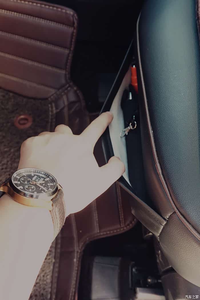 主副驾座椅前面都有储物袋,我在这里放了根甩棍防身,收藏隐蔽,拿取方便。
