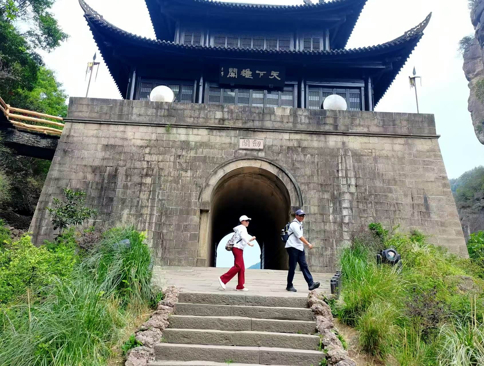 一路闲逛游玩到了剑门关关楼,关楼始建于三国时期,是蜀汉北伐的咽喉要塞,它状如门户,“倚崖砌石为门,垒石为关,置阁尉戍守”。现存的关楼是2009-2010年上海同济大学在震后采用钢结构与传统木构结合技术重建的,关楼底层为石拱券门洞,中层箭楼悬挂“天下雄关”匾额,与周围的险山幽壑浑然一体,尽显雄伟壮阔。