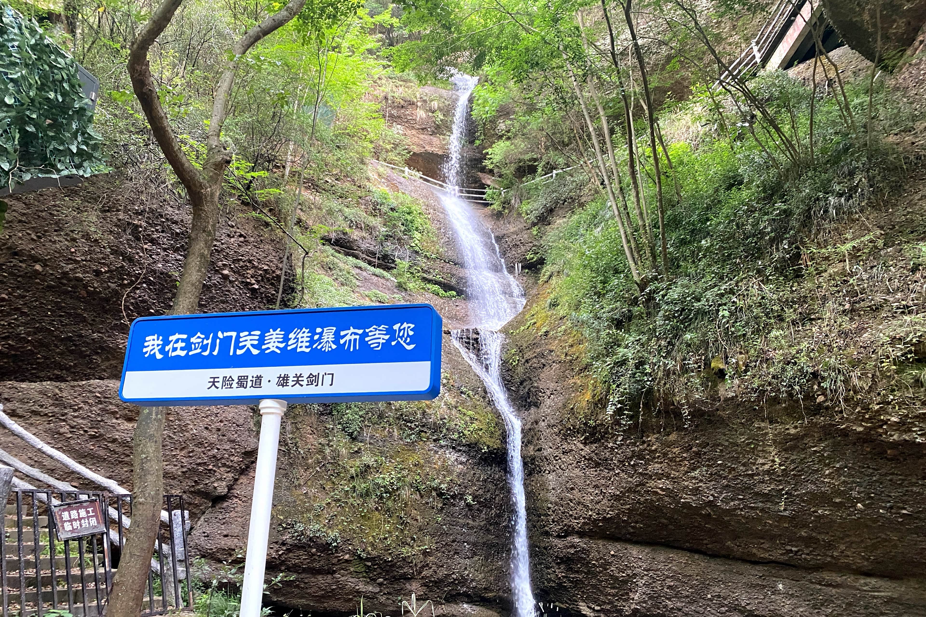 沿着步道慢慢走向关楼,沿途剑山风光尽收眼底,听导游讲着三国故事,还会经过姜维瀑布,水声潺潺中仿佛能触摸到历史的脉络。路上能看到姜维的头像~这位蜀汉名将曾在此据守剑门关,与魏军展开激战,以少数兵力多次击退强敌,坚守蜀汉最后的屏障,他的忠勇至今被后人传颂。