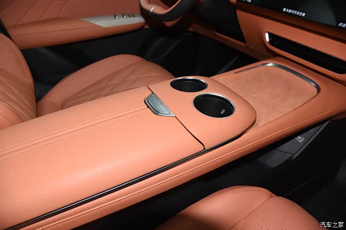 前排中央通道处还配有中央扶手,皮质质感包裹手感不错,还带有两处杯架和前排无线充电功能。