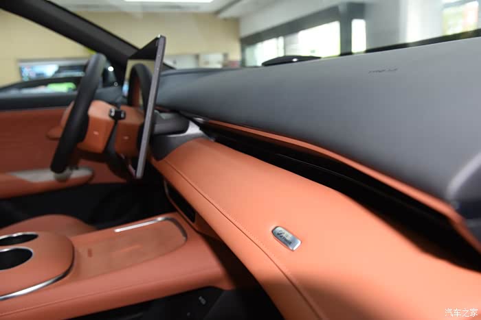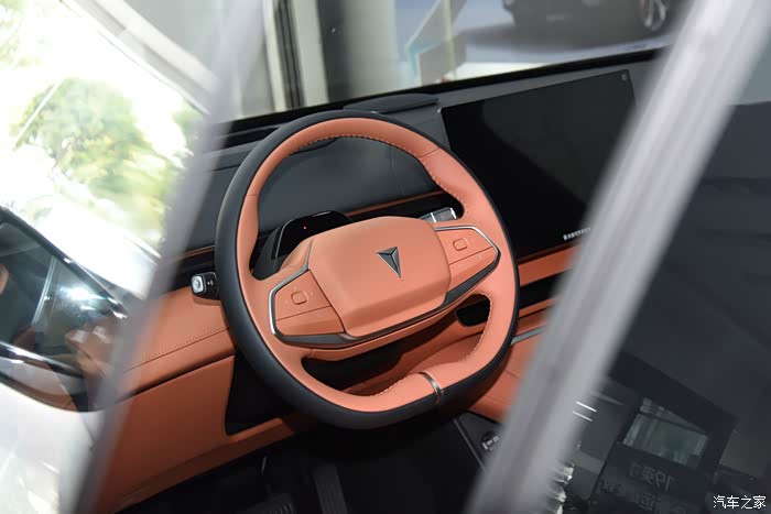 传统的仪表盘被取消,整体风格与特斯拉相似,但与特斯拉的“毛坯”设计相比,深蓝S7在细节优化和软质材料的大量运用上表现出色,使得内饰质感更加高级。方向盘采用两辐样式设计,外圈覆盖着一层真皮材质,把握上去质感出色,多功能按键分布在方向盘的两侧,便于驾驶者日常操作。