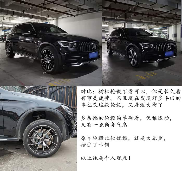 轮毂改装,我要多说一点,因为里面的事情实在太多太复杂了! 改了卡钳以后,因为豪华版的glc轮毂太宽大了,挡住了amg的大鲍鱼。于是有了改轮毂的想法。当时着了迷一样的想改glc43的那款树杈轮毂,但是问了改装店,一套轮毂要4.5个W。。。实在是太贵了。 于是又了解了国锻的轮毂,而且大家都说国锻轮毂比原厂的铸造轮毂更好。几天之内联系了一家做轮毂改装的,帮我定制了国锻的glc43那款轮毂,用的glc原车数据。等了将近半个月,终于到货了。 怎么说呢,,,刚看到第一眼,的确很惊艳,装车也很顺利,但是装完车,轮毂和轮胎结合处,感觉不是太好,心里不是太爽。改了国锻轮毂的感受: 提速更快了,转弯更轻盈了, 这主要是得益于轮毂重量的大幅减轻。但是。。但是。。。严重的问题来了: 车内噪音明显增加,方向盘震动明显,路上的沟坎,小石子震动都能传到车内,还有车内有嗡嗡的低频共振!!完全没有了奔驰那种行驶的质感。我赶快查资料上论坛,很多解释就是: 锻造的轮毂密度增大,噪音和震动传递更快,这样导致了车内的噪音和震动加大。还有人说因为改了轮毂,打破了原来悬架的数据平衡,引起的共振点转移。。。后来在论坛也发现了有车友遇到了相同的问题。现在我可以很负责的告诉遇到相同问题的人: 是轮毂质量问题。国锻轮毂质量是可以的,这里的质量是说不会出现大事故, 但是他们就是做了一个外形,有没有经过严苛的实验室测试,各种路况下的路试,我们就不知道了,所以装车以后,就会出现意想不到的问题。装车一天,果断把这个轮毂退了,损失了大几千也无所谓,毕竟这个嗡嗡的噪音和震动实在受不了。紧接着我就去寻觅glc43的拆车轮毂,功夫不负有心人,终于在东莞找到一家价格合适成色又可以的号称是拆车的轮毂。于是我飞奔过去。结果店家说glc43的那套轮毂没到,你可以看下这款多辐的有货的轮毂。 也算是歪打正着,突然发现这个轮毂比glc43的树杈轮毂更运动,更优雅,又更商务!当时心动了,想立马下定。 但是立马又冷静下来,仔细的检查这个轮毂, 因为很多人说拆车的轮毂很多是经过修复的。 在我仔细的检查之下,发现了几个问题: 轮毂的正面高光的部分有些小凸起, 轮毂背面也有小的凸起,钢印感觉很模糊。看到这些,我就感觉这轮毂像是修复过的。 但是那商家解释说:奔驰做工没有你想象的那么完美,轮毂的模具肯定不会100%的平滑,铸造的轮毂都会有这些小瑕疵。貌似解释的通,但是直觉告诉我先不要太早下定论。当天没有下定,回到家里以后,也真是碰巧,在网上遇到一个说是卖奔驰原厂件的商家,于是和他联系了一下,我们竟然离得不远,于是第二天便过去实地考察,看了他们的库存,当天就定了!在此,我可以很负责的告诉大家: 如果有商家对自己商品瑕疵用奔驰做工不是很完美来解释,你可以直接扭头走人了! 奔驰的原厂件,做工是非常完美的!这套amg轮毂的做工,我真的要再次用完美来形容。 轮毂正面非常光滑细腻,没有一个小点的凸起。背面的涂层也是非常的光滑,钢印圆润清晰!四个轮毂重量一模一样,毫克不差!还送了我4个奔驰原厂的轮毂盖,做工也是相当的完美,没有一点毛刺!当天装车,整个车的气质立马就上来了!而且六活塞大卡钳也显露明显,配上390的打孔大刹车盘,真的是完美!换完这款轮毂的感受:提速更快,毕竟是amg原厂的轻合金轮毂(大家可以去了解下奔驰的轻合金轮毂是经历了多少的测试),重量比原来的轻了很多;没有噪音,没有低频共振!车内很安静! 转向轻盈,操控更好! 现在再对比glc43的树杈轮毂和这款轮毂,是不是感觉这款轮毂更加完美?