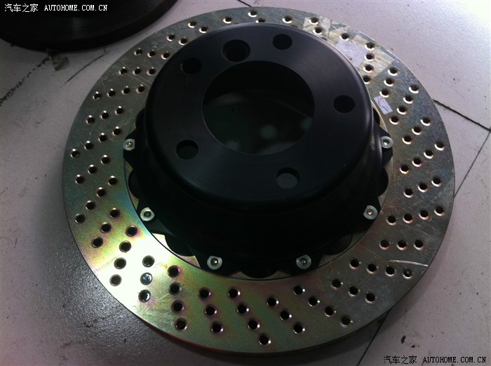 打孔的刹车盘,很有视觉冲击。没装之前上面有点黄色,刹车装完试车之后,上面的这层保护膜会去掉,露出原本的铁灰色。