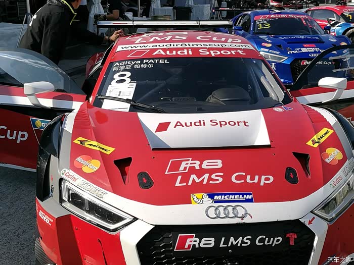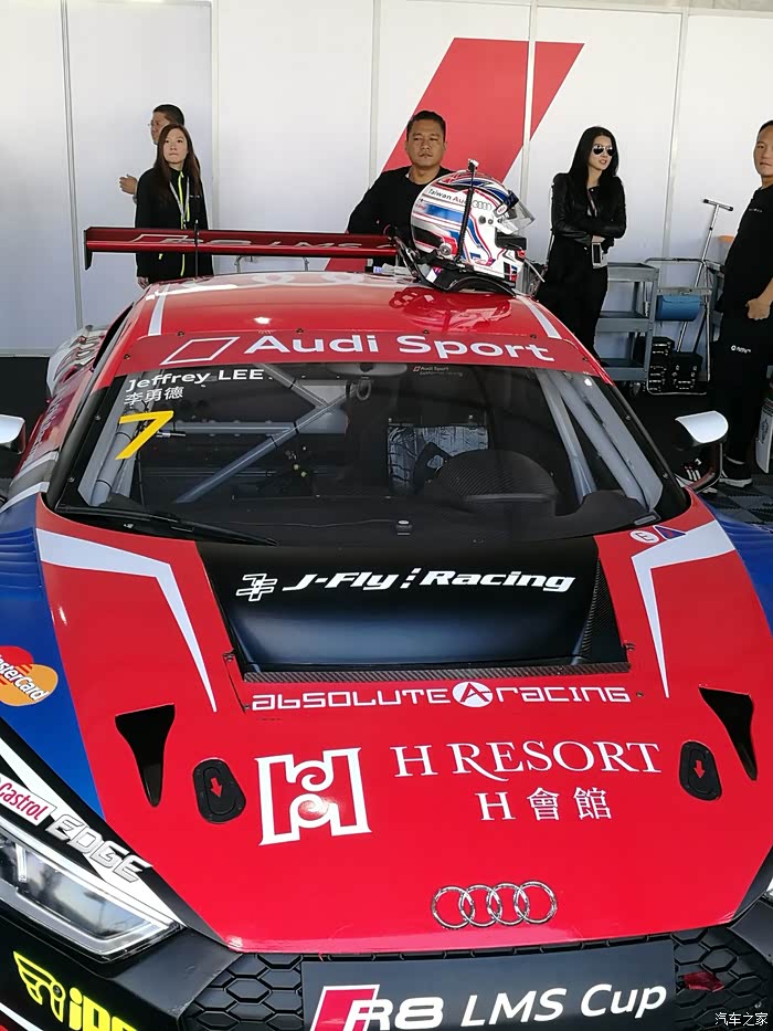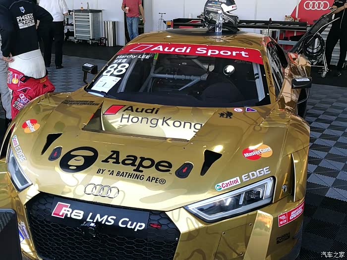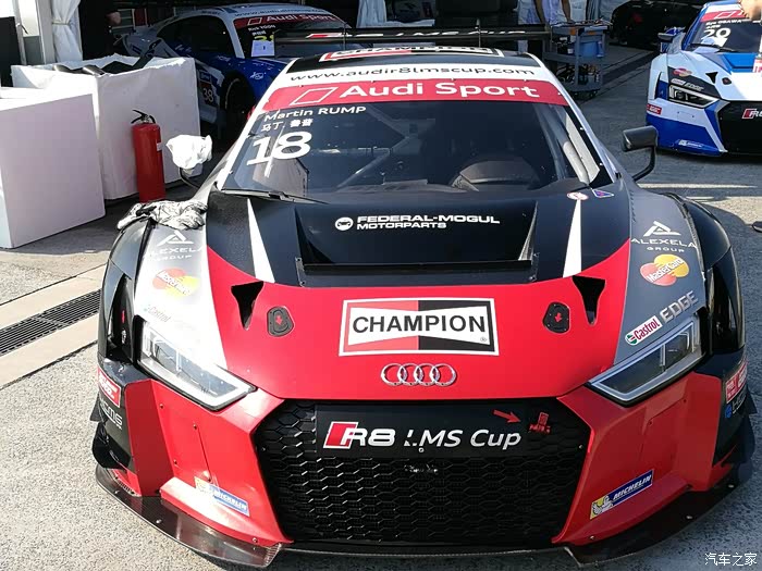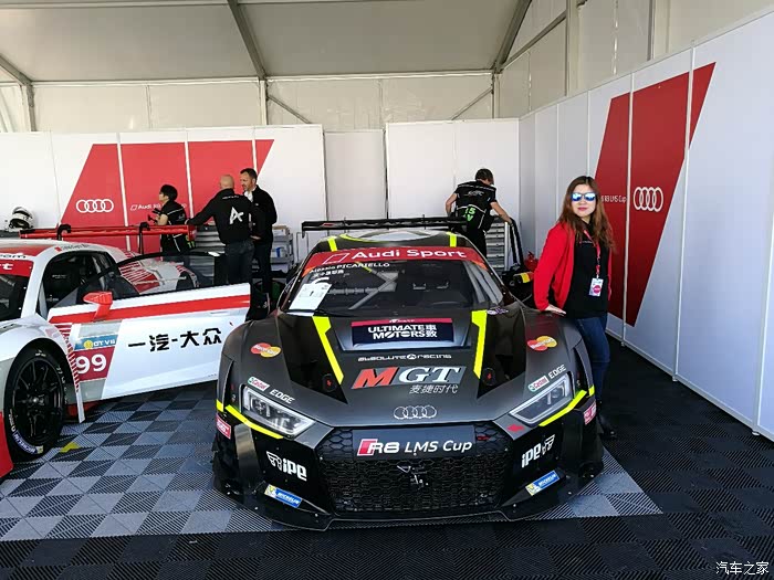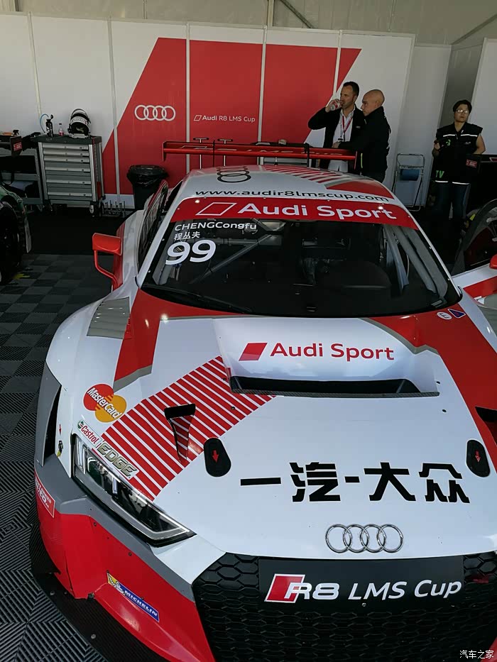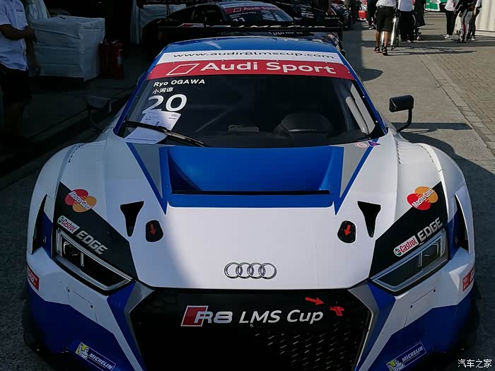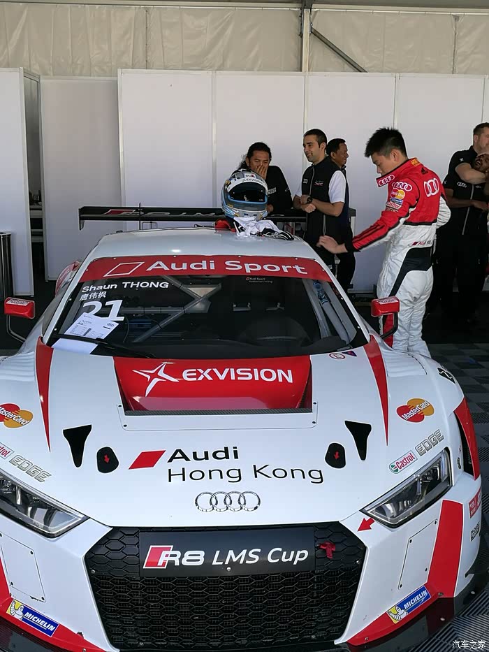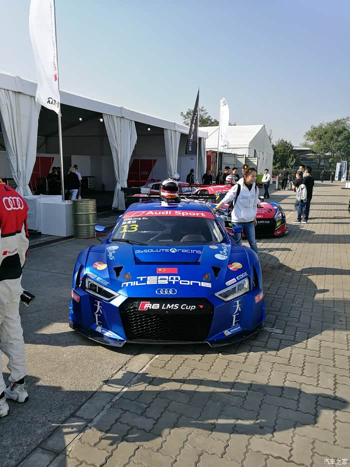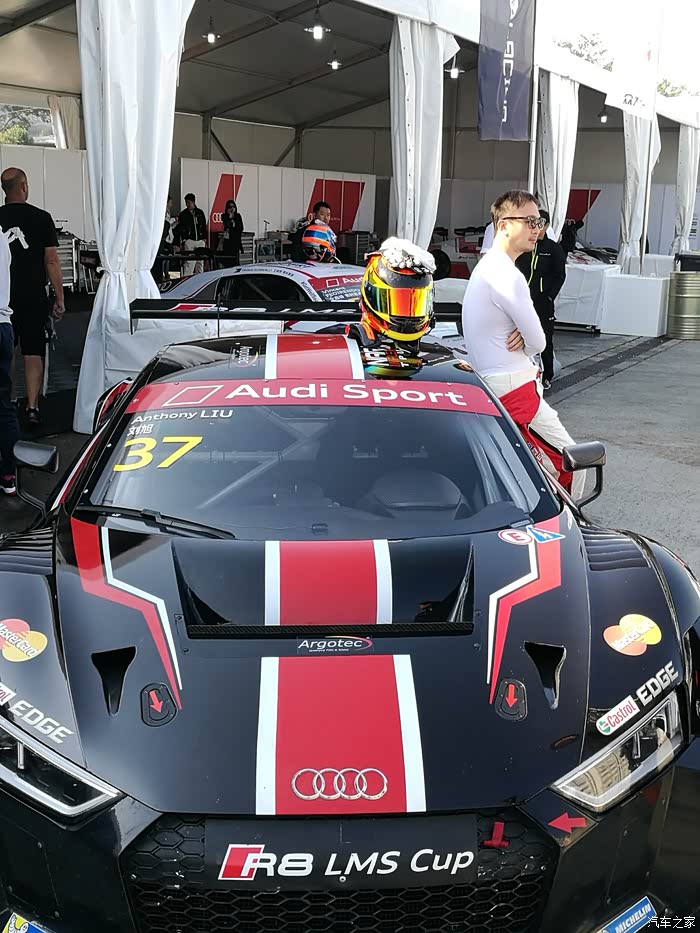 下车后各路英豪按照指引牌直奔奥迪R8赛车停放车篷区,拿起照相机或手机对着赛车狂按快门,记录赛车的英姿。先上部分车手的赛车