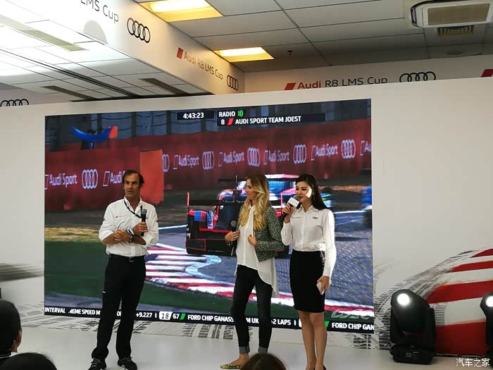 在休息室,除两位美女主持人外,另一位主持人就是Audi Sport传奇车手埃曼努莱.皮罗,他从专业车手的角度现场给车迷们讲述赛车的专业知识以及比赛的感受