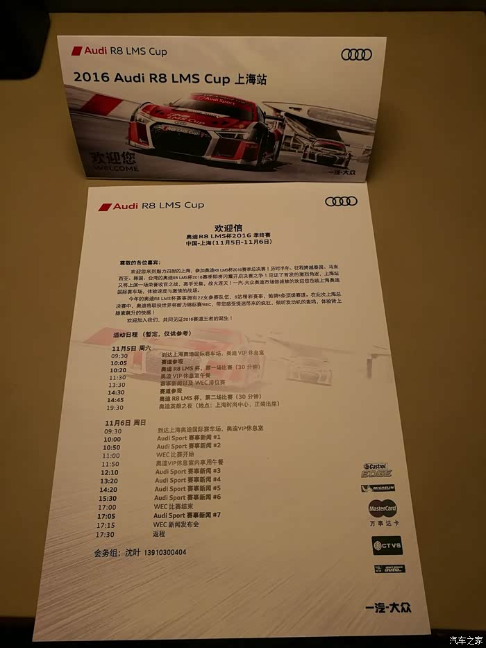奥迪R8 LMS杯2016赛季于2016年5月21日在上海奥迪国际赛车场揭幕,见证了首发的激烈角逐,历时半年,征程跨越泰国、马来西亚、韩国、台湾,11月5-6日荣誉收官之战又回到了上海奥迪国际赛车场,。作为中国最大的车友会Q5中国自驾盟自然也接到了奥迪诚挚的邀请,由盟主秒猪女侠的带队,本人有幸成为Q5中国自驾盟代表之一,在这个充满激情的赛事周末,不仅近距离观看了2016奥迪R8LMS杯季终赛,同时也切身体验了国际顶尖赛事国际汽联(FIA)世界耐力锦标赛(WEC)上海站的速度与激情!下面根据日程安排把本人亲身经历和赛场精彩花絮给各位车迷一一分享。