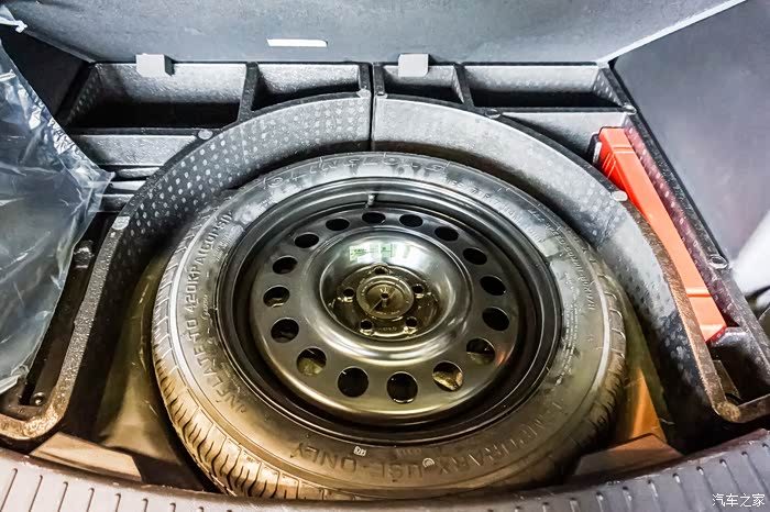 打开后备箱隔板,里面是全尺寸的备胎和随车工具。