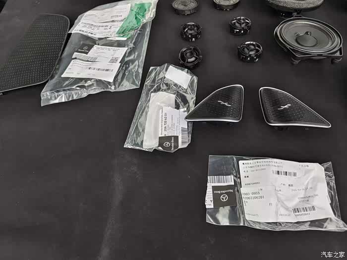 看一下音响配件图片,大大小小一共15个喇叭,还有低音和饰板,装在哪些地方,现在还不清楚