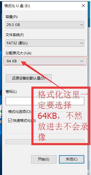 风光580行车记录更换内存卡方法,给大家分享下,分配单元大小一定要选择64KB的,不然不会录像