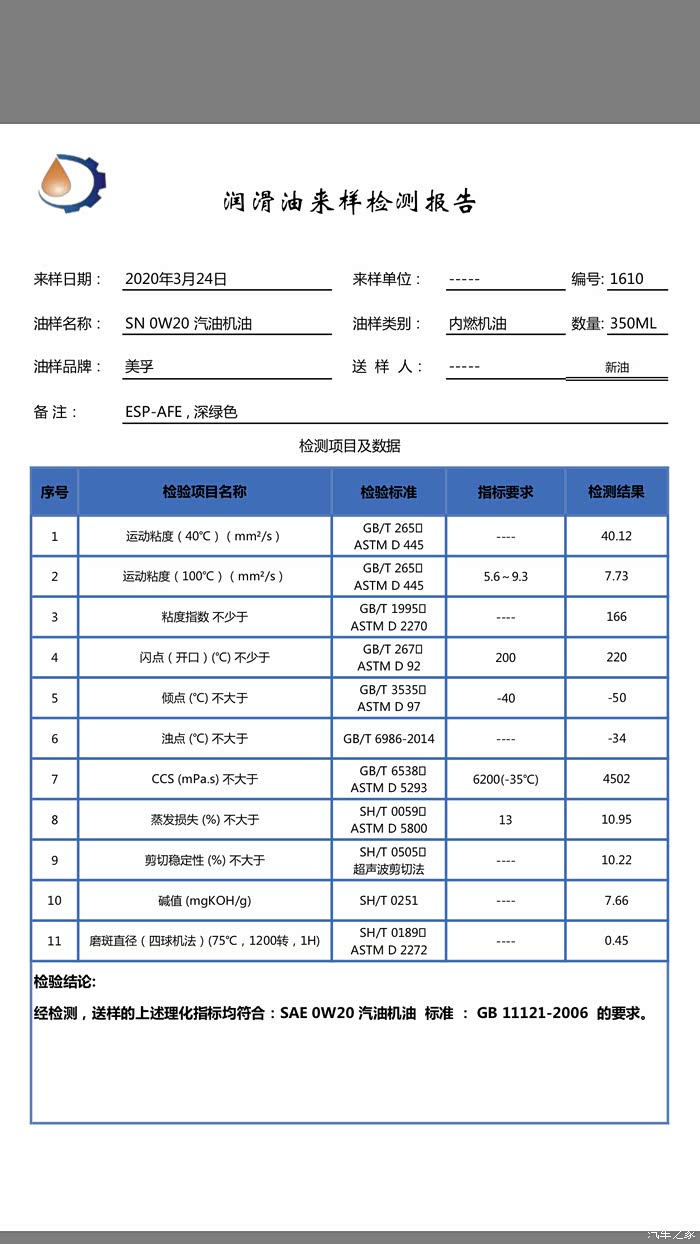 ,美孚0W20标号的机油测过很多了,美版、日版、欧版、国行,EP 、AFE 、ESP 、经典黑瓶等等等,唯独国行金美孚“升级配方”版一直没测,最近一位车友保养想选用这款机油就送来检测了一下,我们一起看看他的各项指标如何。带有“升级配方”字样的金美孚0W20不同于其他版本金美孚,他其实是美孚的顶级产品AnnualProtection的行货版本,俗称美孚AP,官方MSDS安全文档显示PAO含量百分之60-70,基础油非常优秀。