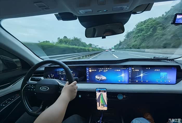不过蒙迪欧的底盘质感是非常不错的,不管是坑洼路段的悬架表现还是高速路段的稳健,蒙迪欧的路感反馈都比较清晰,让我信心十足。而且方向盘的转向也很精准,刹车的脚感很不错,让我开起来得心应手。