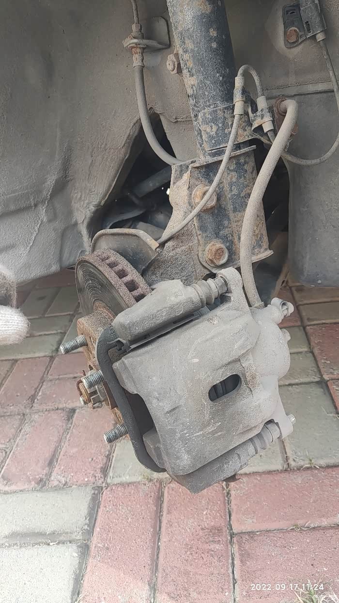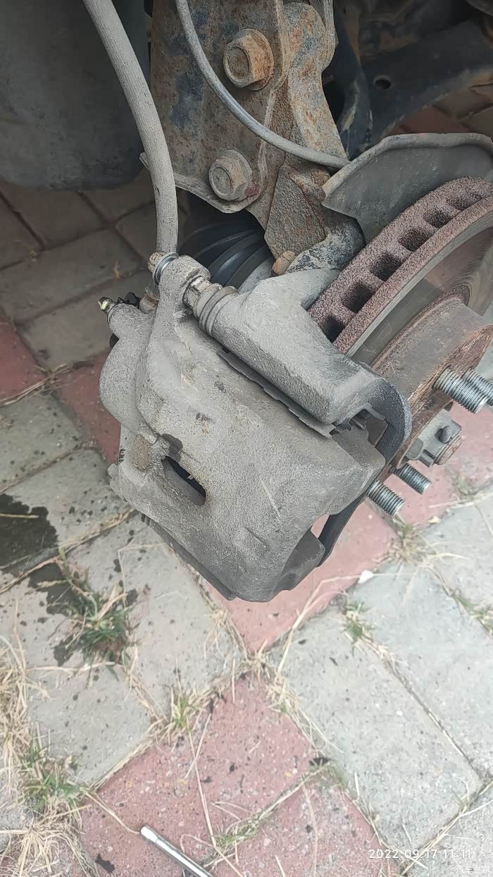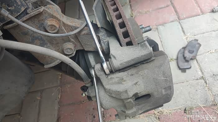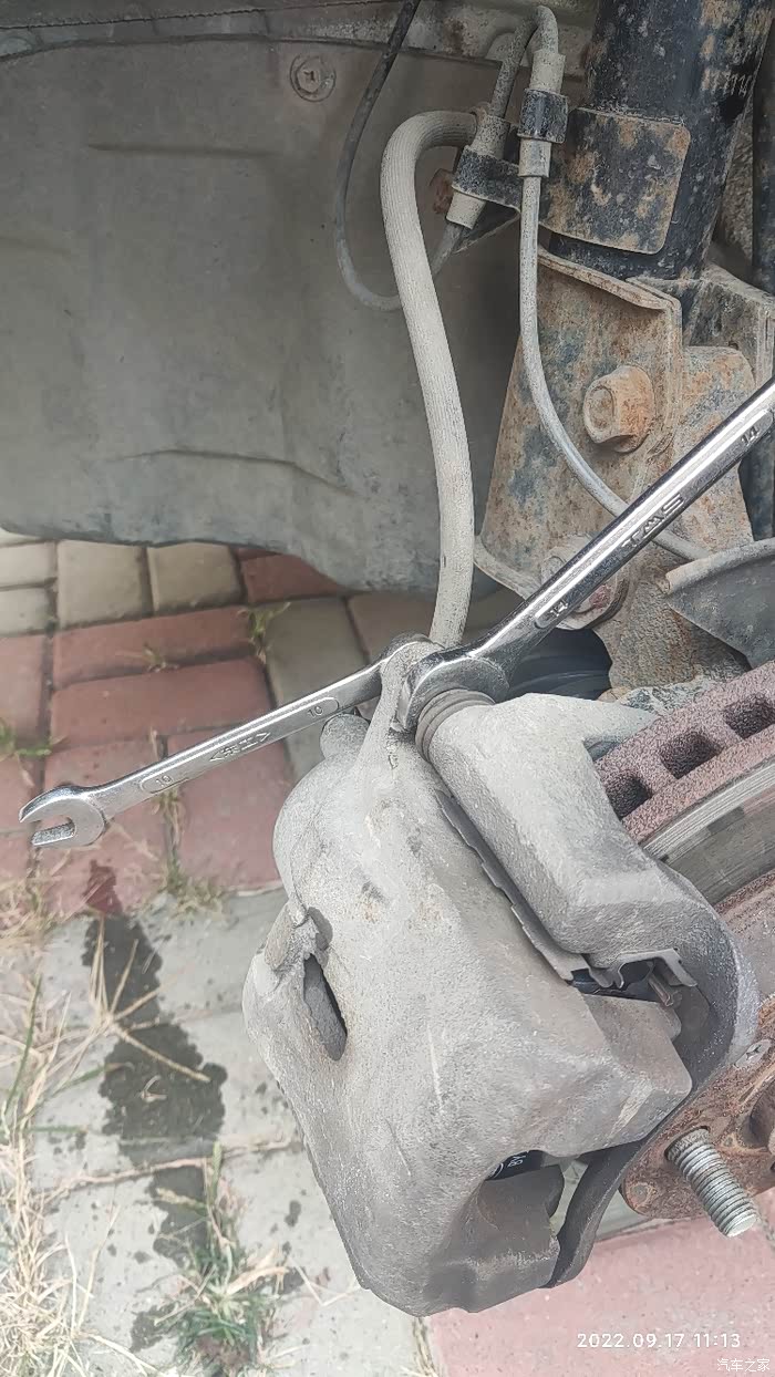 拆下轮胎,拆卸分泵固定螺栓,此处需要使用10mm扳手和14mm开口扳手