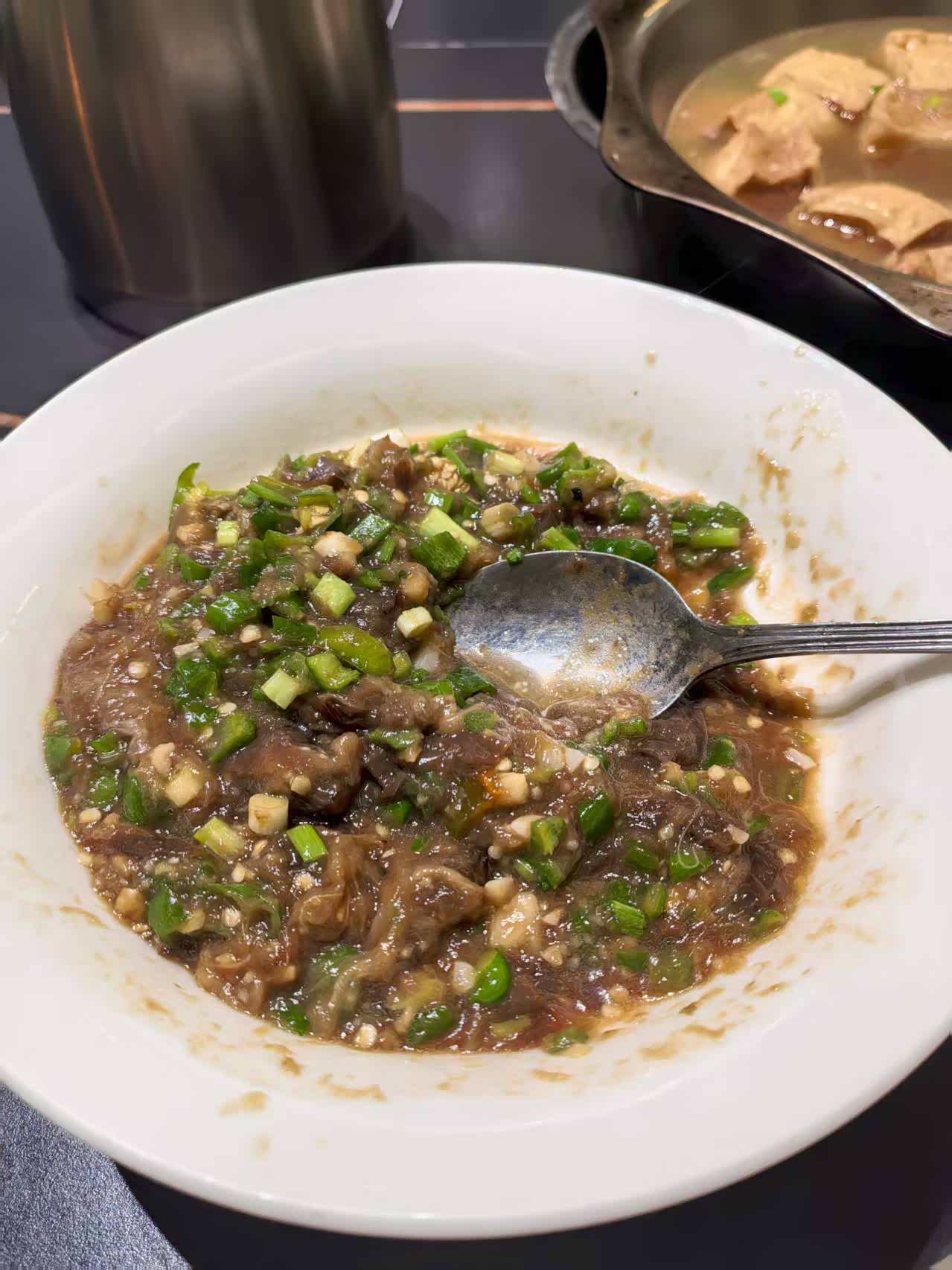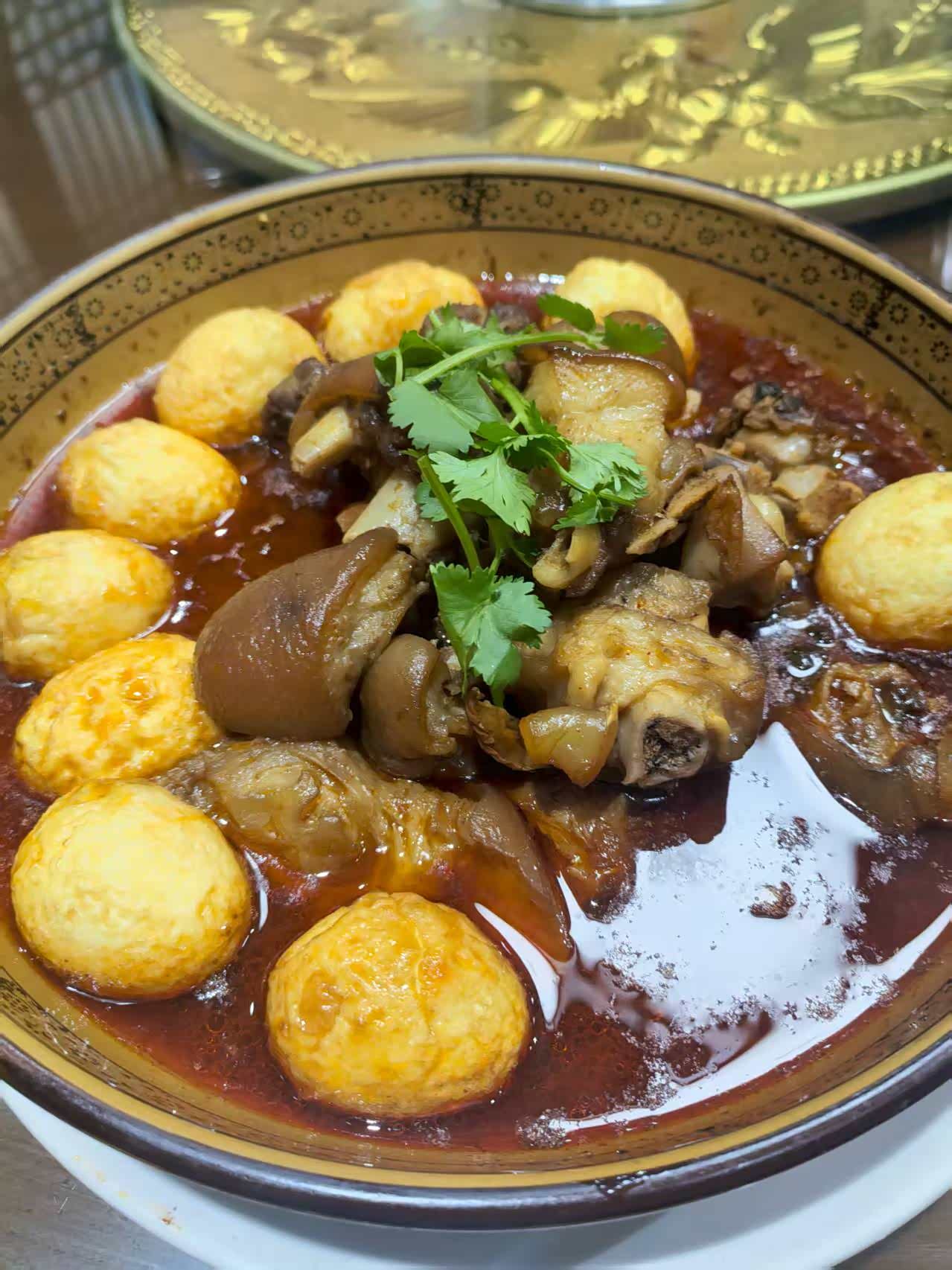 我们点了一道当地最有名的游浆豆腐,这道菜堪称和平古镇的美食名片。游浆豆腐的制作工艺独特,用陈浆点卤,口感嫩滑,豆香四溢。端上桌来,只见豆腐色泽金黄,上面浇着一层浓郁的汤汁,撒上一些葱花和香菜,光是看着就让人垂涎欲滴。夹起一块放入口中,豆腐入口即化,汤汁的鲜美与豆腐的嫩滑完美融合,让人忍不住一口接一口。除了游浆豆腐,我们还点了红烧肉、杀猪菜、和平鲤鱼等特色菜肴,每一道都做得十分美味,让我们吃得饱饱的,满足感爆棚。