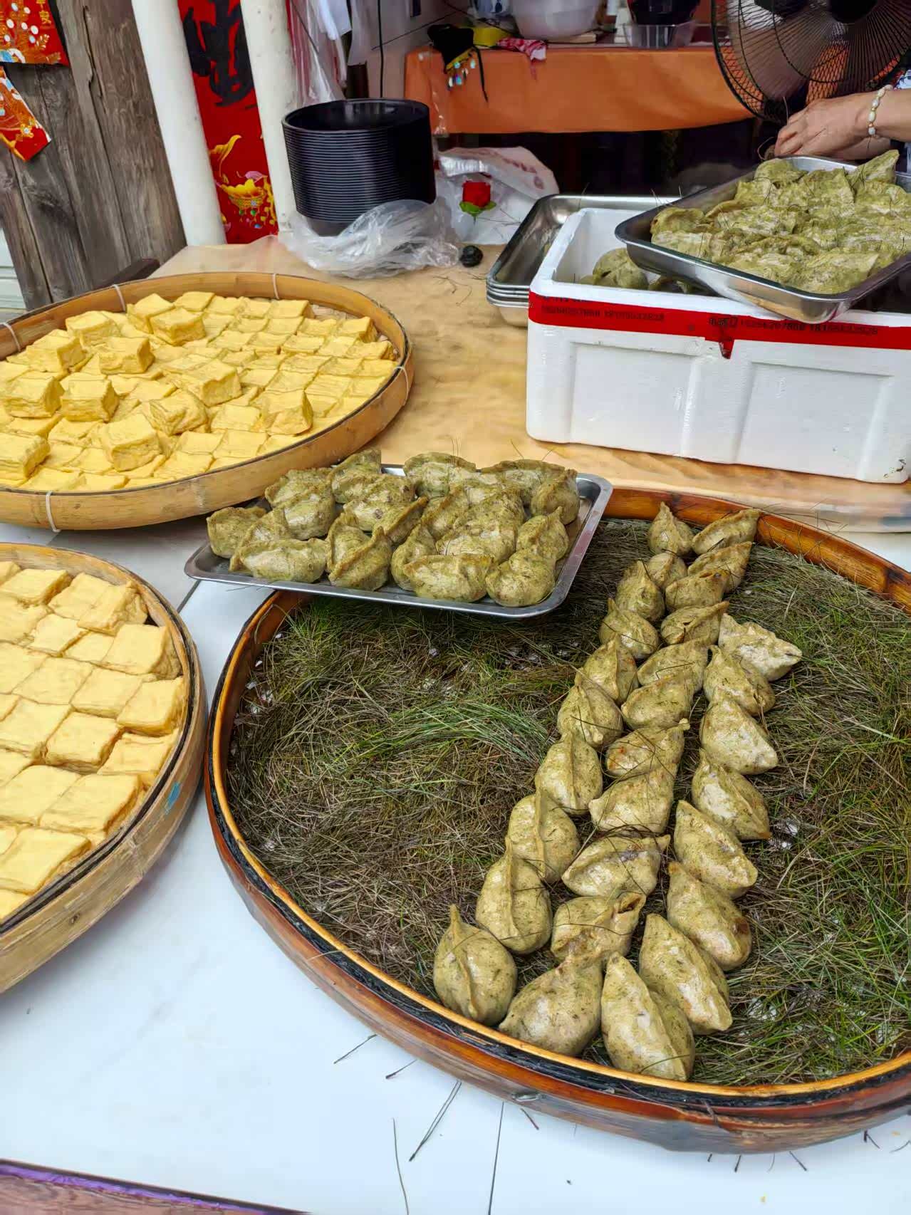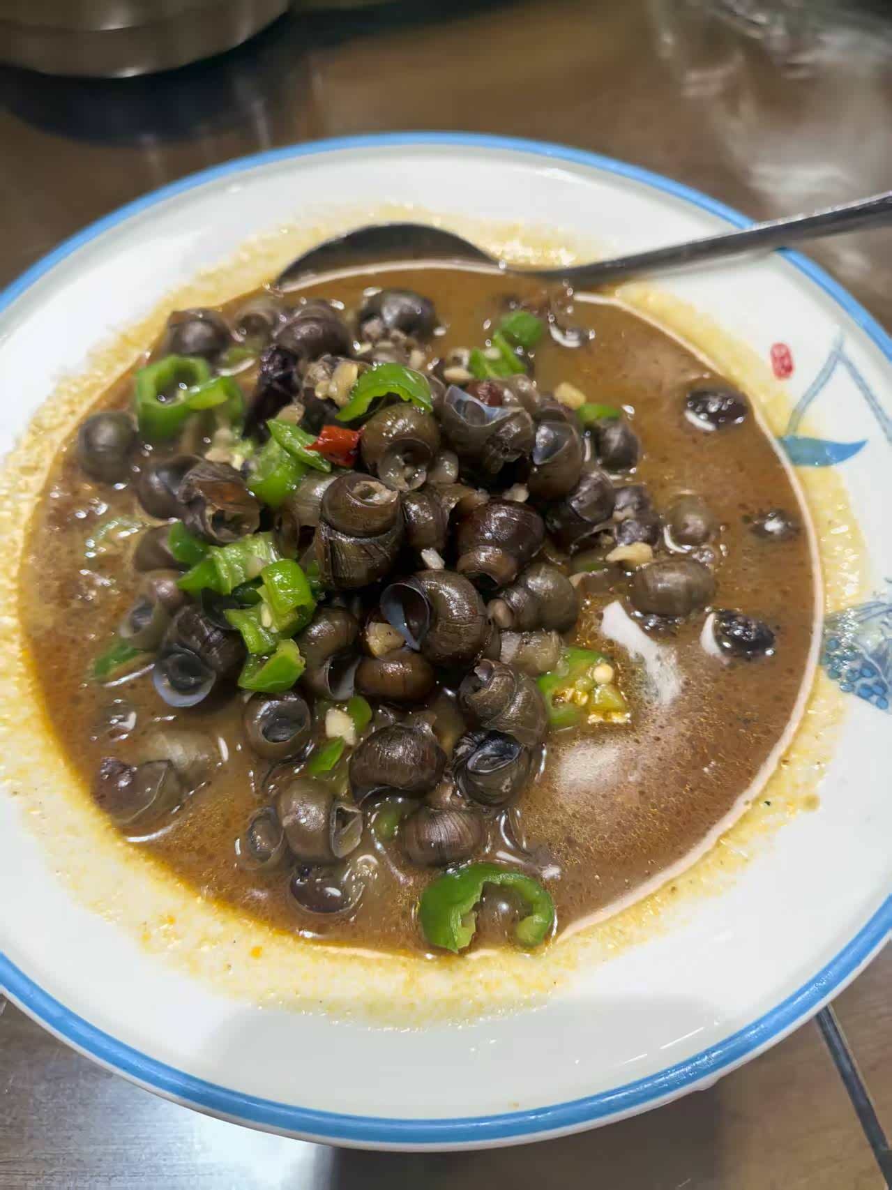 除了正餐,古镇上还有许多特色小吃也不容错过。比如包糍,这是一种用糯米粉和野菜制成的传统美食,口感软糯,清香可口。还有和平田螺煲,田螺肉质鲜美,汤汁浓郁,香辣过瘾。我们一边品尝着美食,一边感受着古镇的烟火气息,心中充满了幸福和满足。