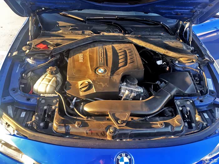 发动机舱内还是比较规整的。现在许多车型的发动机舱中都使用了大面积的塑料盖板遮挡机械结构,虽然看起来美观无比,但是也降低了维修的便利性,也不能直接观察发动机的工况,335i的发动机舱规整程度我感觉是非常合适的。