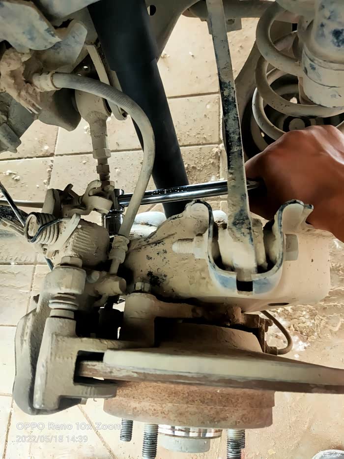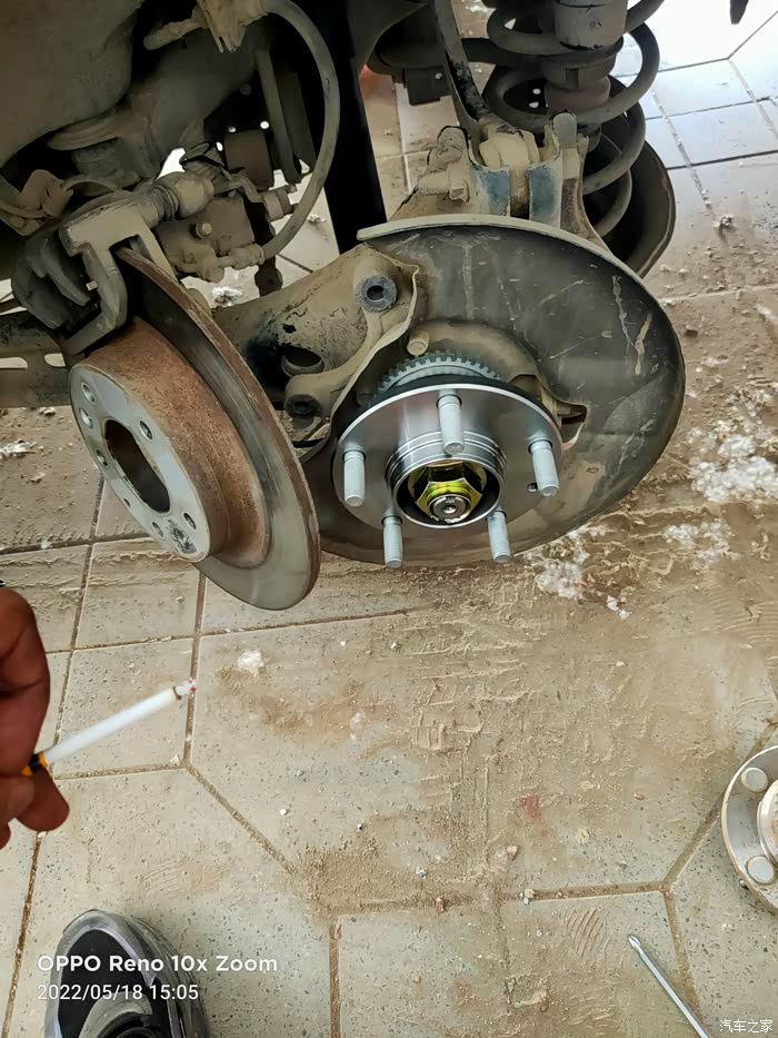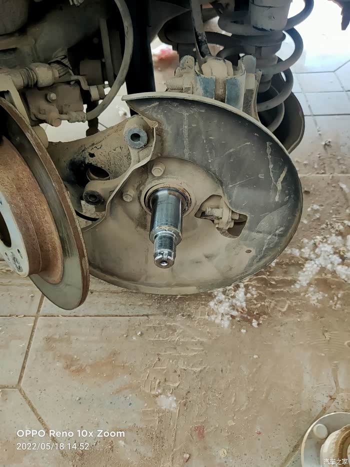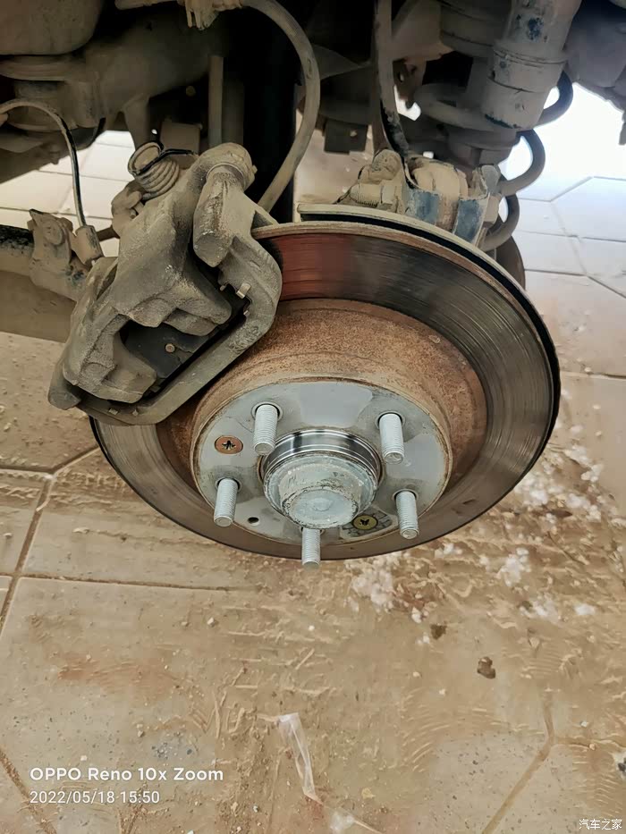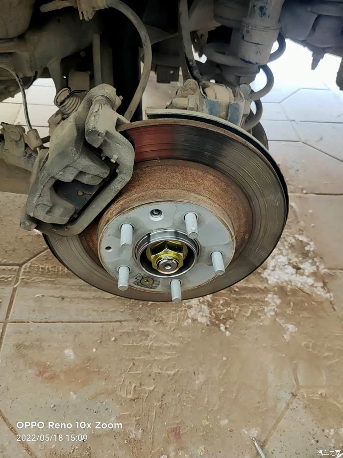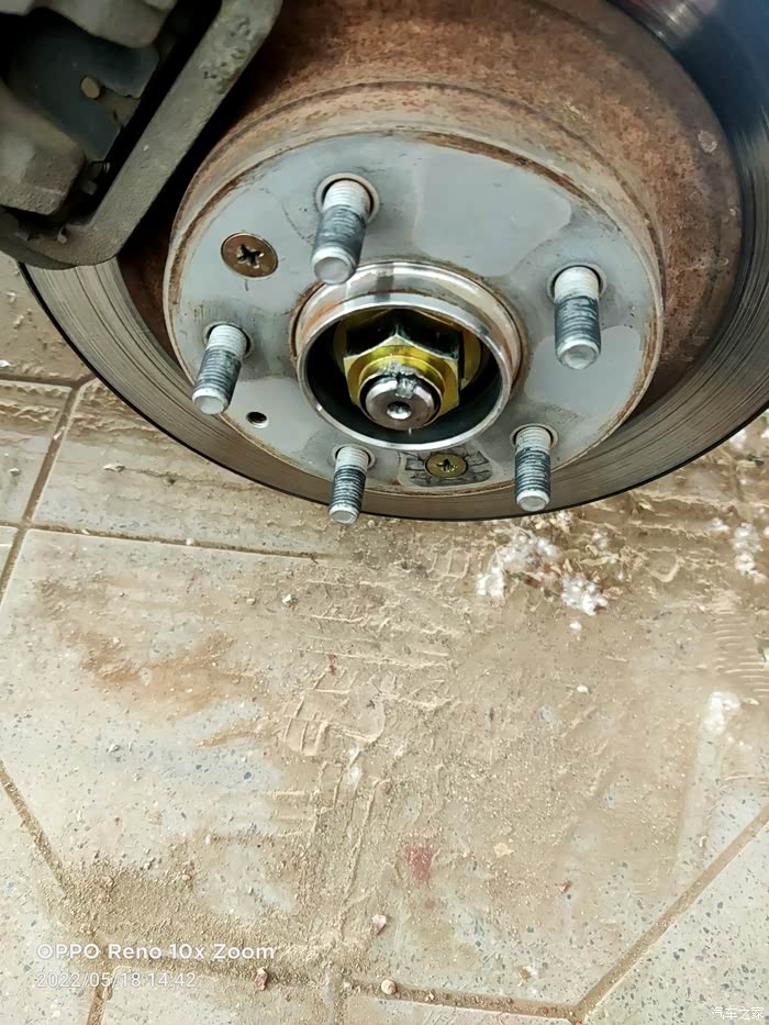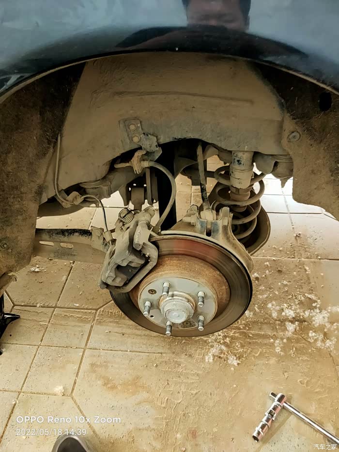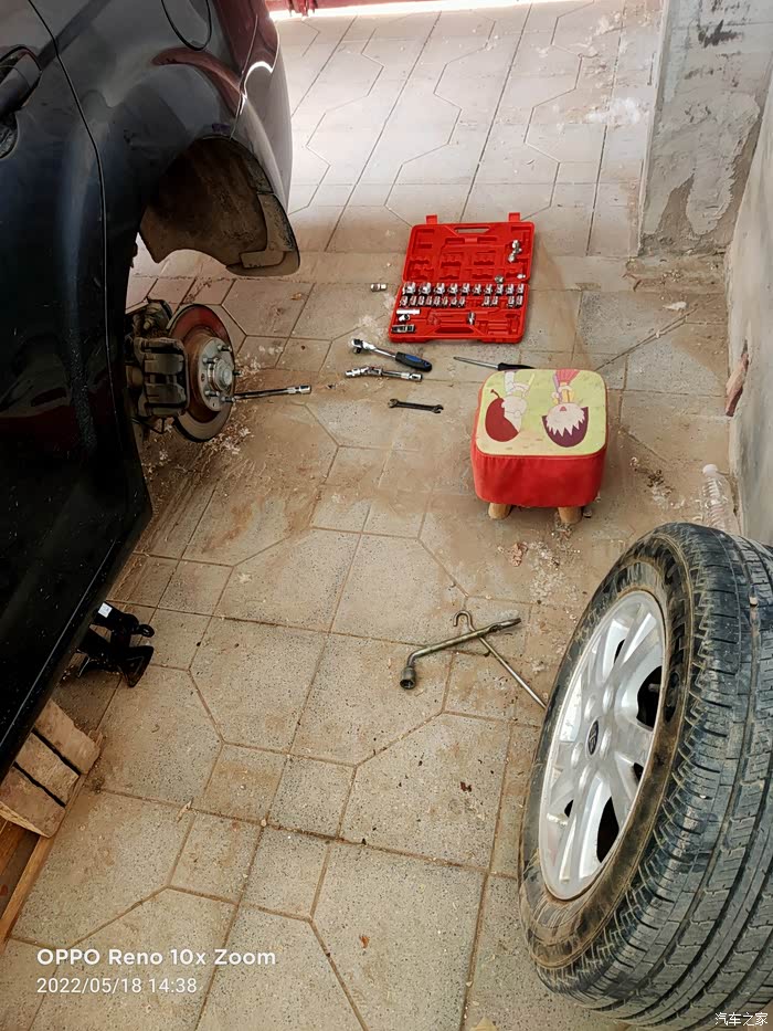 先用车上带的千斤顶顶起来 然后卸掉轮胎 之前轮胎螺丝用气动扳手拧紧的 有点费劲 就是用大铁棍子嘎嘎一顿撬 比较省力 注意不要用猛力 悠着点来