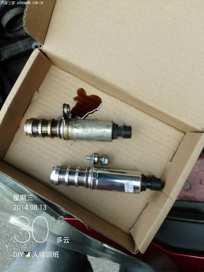 要知道车子出啥问题就首先要知道故障码,于是就先在万能的X宝花了38块包邮买了个蓝牙故障码检测仪,还不错,价格便宜,支持车型多,还能消除故障码等功能,查到故障码P0014后,对应查询了一下应该是凸轮轴排气电磁阀出问题了,进气电磁阀和排气电磁阀这2个部件也是君威经常会出现问题的部位,于是花了150块钱买了一个,记住排气和进气是不一样的,排气电磁阀的头是黑色的,进气电磁阀的头是灰色的,千万不能弄错了。