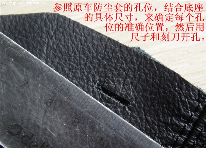 由于旧的防尘套已经变形,所以上面的孔位的位置只能作为参考,同时用尺子结合实际底座上的卡扣的尺寸,用笔在新防尘套上画出来,然后用刻刀开孔。