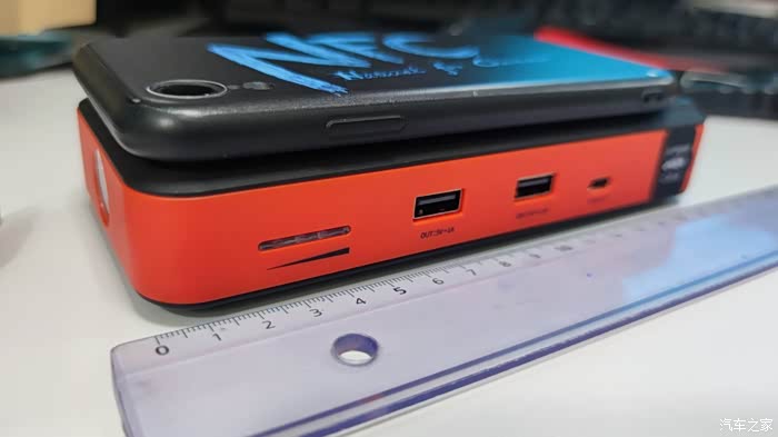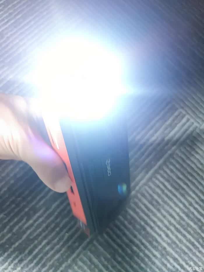 在应急启动电源的另一侧直接配备了一个LED电筒,长按那个醒目的橙红色开关2秒就能打开LED灯。