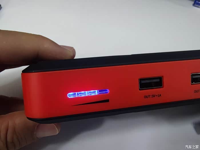 启动电源的主要接口都集成在同一侧,最左边是电量指示灯,接着是2个USB输出接口,可以给普通数码产品充电,比如手机、pad等之类的。输出电流分别是1A和2.1A,满足不同充电设备需求。小小的充电接口是USB Type-C接口。最右侧则是智能线夹启动口。