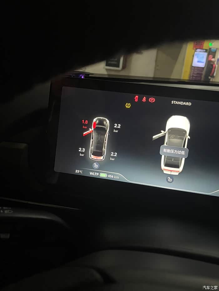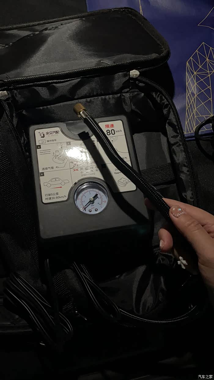 充完电之后发现四个轮胎的胎压只有2.1,就打算回到停车场试用新买的便携充气泵增加点胎压,拆开包装看完了说明书,就开始行动了,第一个充左后轮,很完美的搞定,开始充第二个左前轮,就一直在漏气,漏到了胎压1.8,想着自己操作是不是有误,又试了第三个轮胎,也是漏气,听到充气管有漏气的声音,就不敢再用了,当时晚上十点多,也没有修车店开门了,第二天一早就要出发,当时心急如焚,打开了微信小鹏群咨询了群里鹏友,得知车内有一个充气机,接上点烟器就能使用,这才找出来,充好,松了一口气~