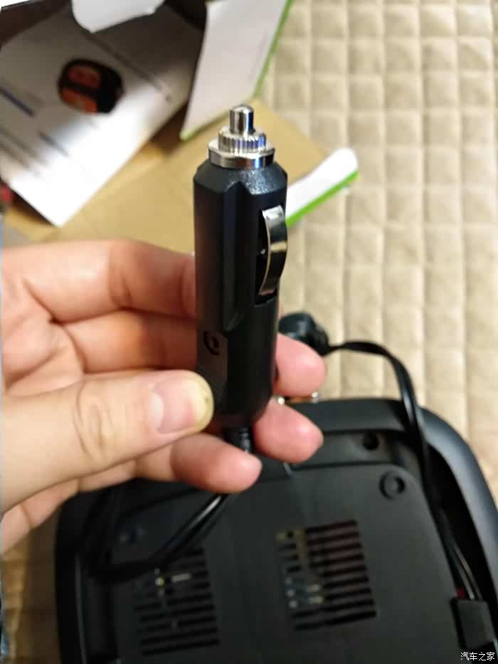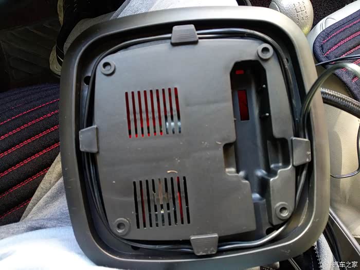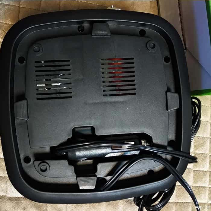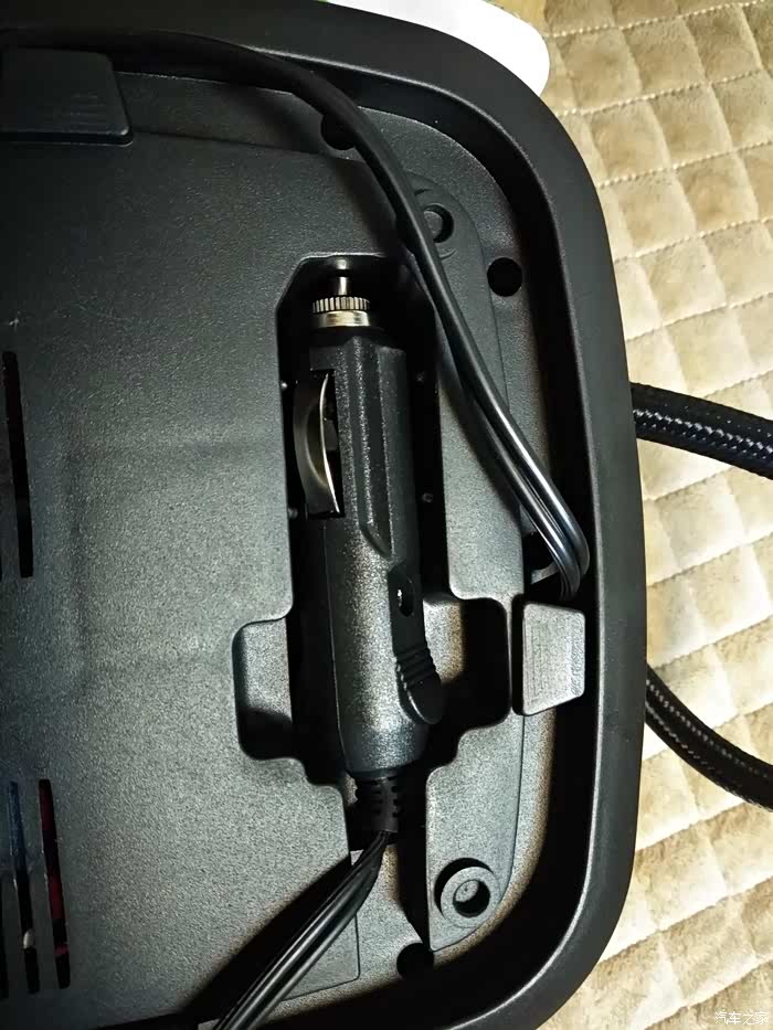 电源线的收纳设计也非常不错,电源线可以绕着底部四边卡槽卷起来,充电头是12V点烟器插头,充电头在卡槽里放得很稳当。
