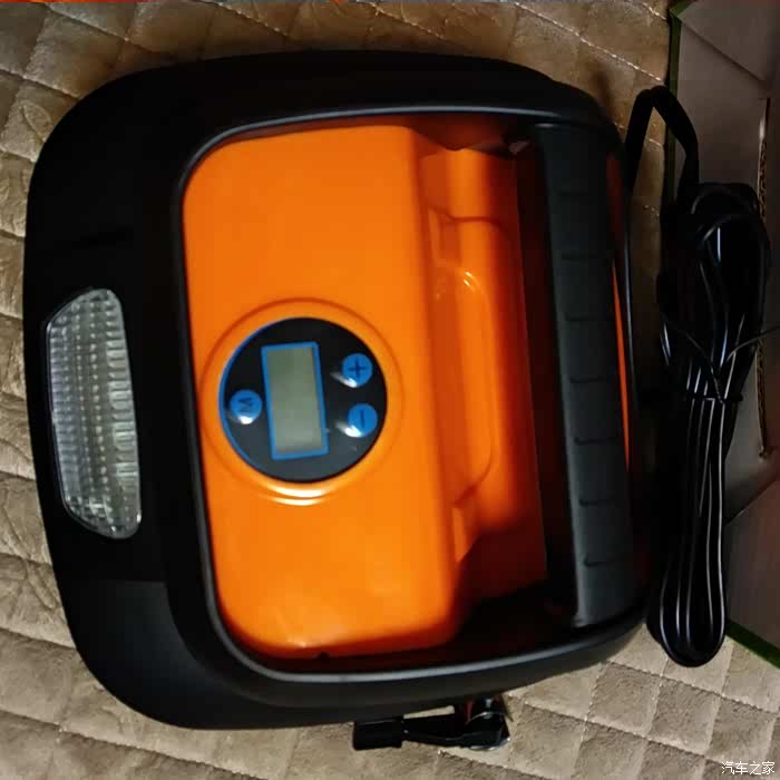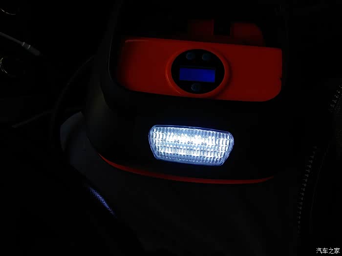 领臣预设胎压式车载充气泵机身尺寸为18cm*18cm,厚度9cm外壳主要使用的材料是ABS塑料的。整体非常美观。正面主要有液晶显示屏、预设调节胎压装置、便携式提手,最人性化的是,提手下方有两个开关,一个是LED照明灯的,一个是充气泵的工作开关。