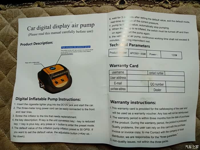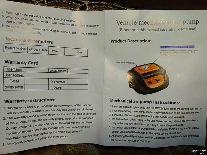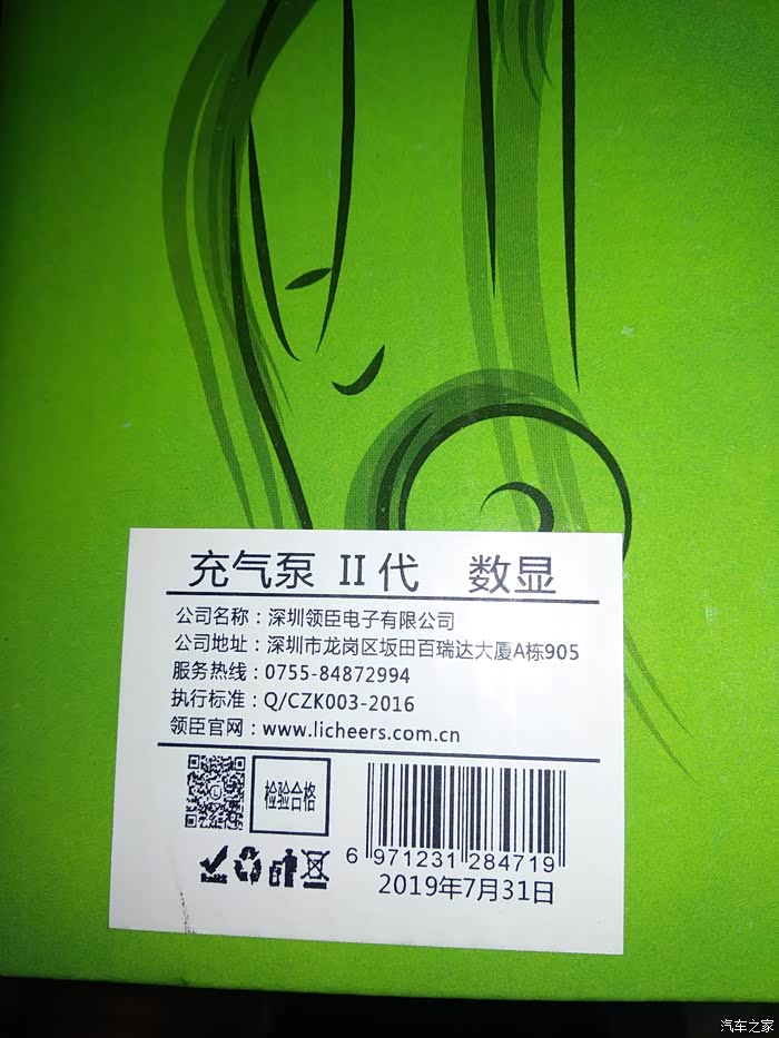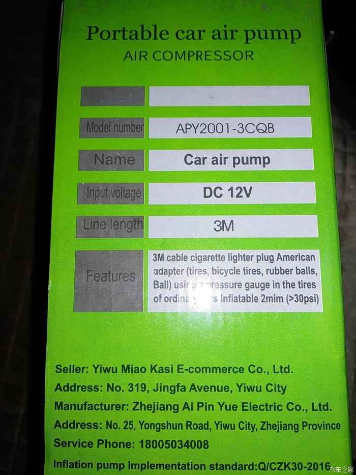领臣预设胎压式车载充气泵是彩色的,以绿色为主色调,难道是想说它绿色环保吗?但是原包装盒上是全英文的,标的产地在义乌,销售商是义乌妙卡思,但是贴的这张标签,标示着公司是深圳领臣电子有限公司,公司地址在深圳市龙岗区。英文不好,我就不纠结这个啦。上面写的电源线有3M,应该足够一般车辆的日常使用了。充气泵有种沉甸甸的感觉,让人感觉质量很好的样子。继续,开箱。