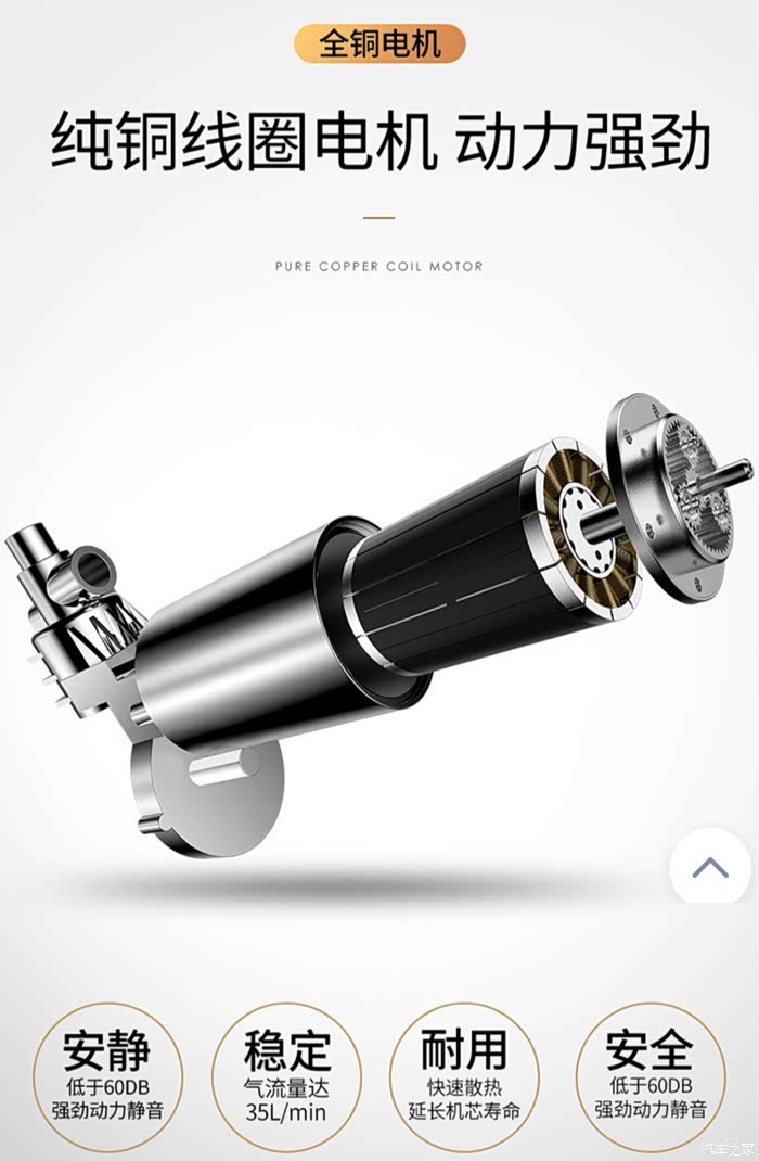 动手能力不足,自己拆不了外壳,就借鉴下图片吧,纯铜线圈电机,动力强劲,经久耐用,气流量35L/min,已经到了市面上主流充气速度。