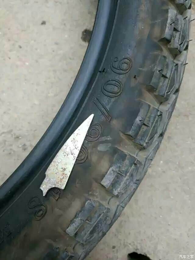 刚过1000公里,在快速通道上80码试试车,就碰到爆胎,还好路上没车,也没踩刹车,象走在泥巴上一样,软软的左右晃,还好是上波,三五十米停下来了,求助未果,只好带火推行五公里进修理铺,扒下车胎一看,傻了,手指头那么长一把刀子在里面!而从外面找不到口子……唉!够倒霉的,换个真空胎吧,230元一只,台湾产的。