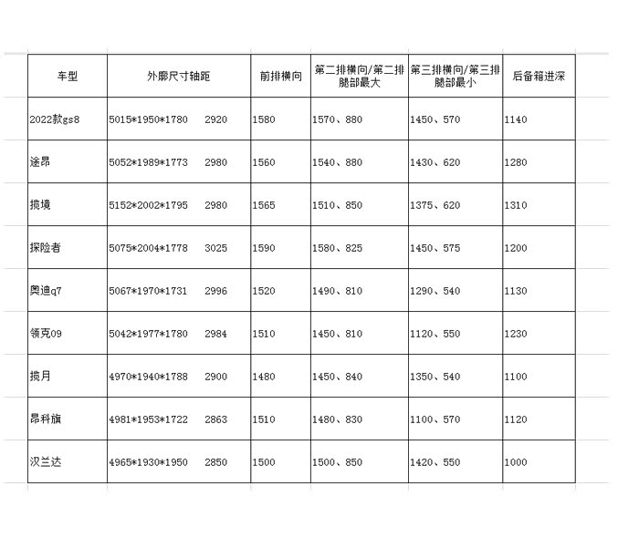 我统计了一张表格,编列的部分主流中大型六七座SUV的内部尺寸相关参数,来做一下分析。