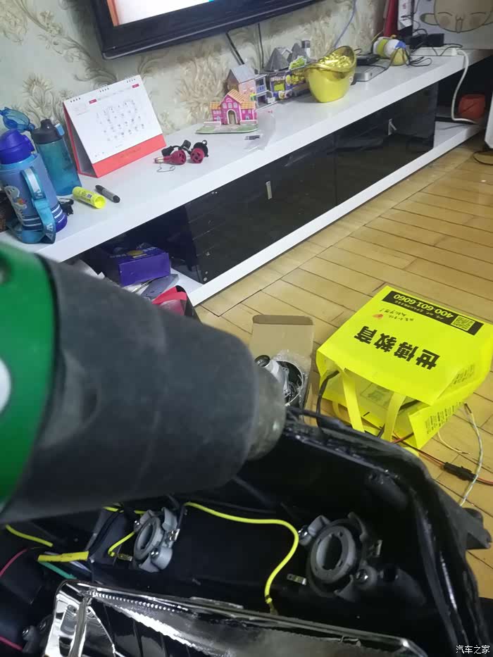 然后第一步开始开灯壳。不像论坛上有人说那样自己用纸箱子,我那时候热风枪还没到货。只有一把电吹风。窍门就是打到最高档。吹大灯的锐角部分,也就是小灯那个位置。多吹一会儿。然后用一字螺丝刀撬开。撬开一个缝之后,然后用另一把螺丝刀别住。然后顺着缝向下撬开一点,然后继续拿吹风筒吹。然后再吹对面的位置。用手使劲的掰。打开一半之后,用电吹风吹剩下的部分转圈儿慢慢的均匀的吹。然后慢慢的用力就打开了。注意开灯壳之前一定要把小灯拿下来,要不然他能别住。