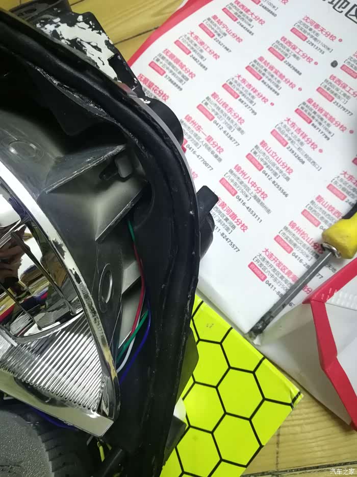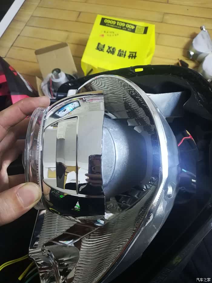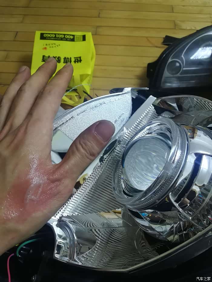 遇上点儿小问题,这个装饰罩比较大,与原车的灯碗有点儿干涉。还好做工不错。很结实而且很有韧性不是那么脆,用小刀慢慢的就割下来了。。