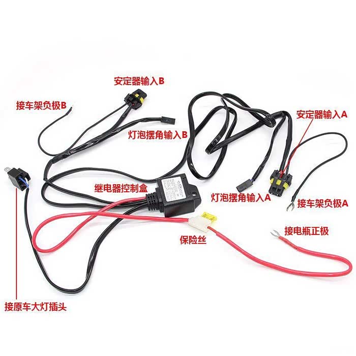H4大灯安装透镜必须使用线束组。这是网上找的一张图,我的跟这个一模一样。灯泡摆角那个接头就是变光马达的意思,需要用一侧大灯插头,另一侧胶带包好不用,连接的地方做好绝缘和防水,无论怎样都避免不了线束凌乱,没法,尽力吧