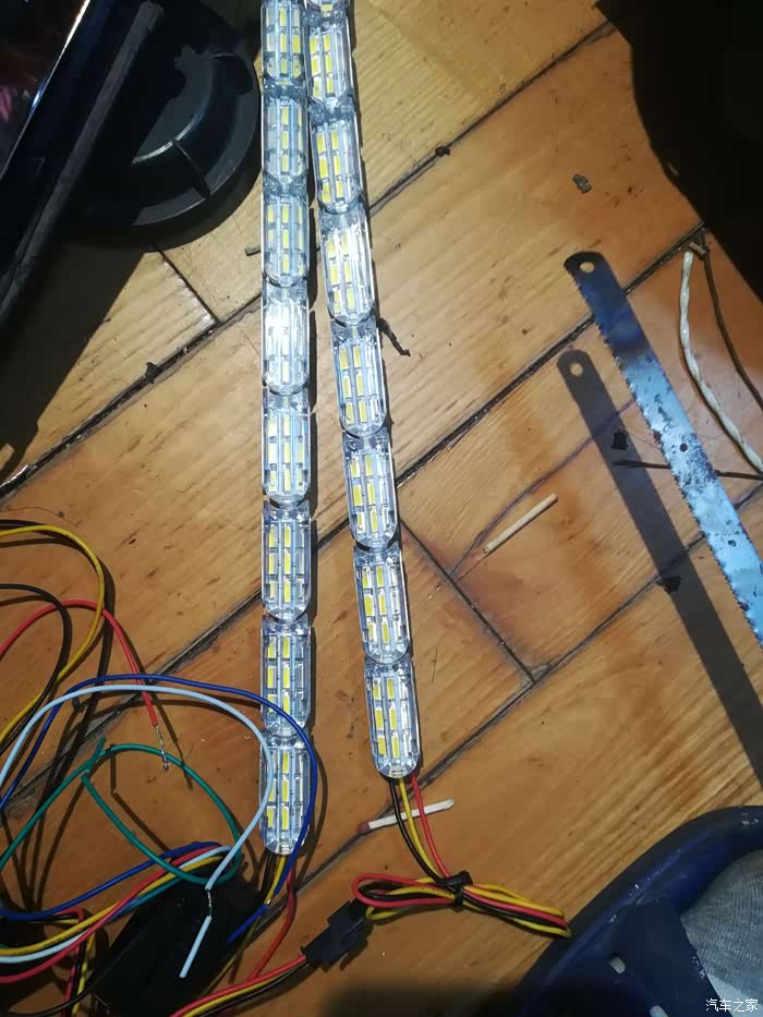 流水转向日行灯也到了,但是这个需要自己裁剪,它这个长度比较长。每一条是12个小灯组组成的,实际上用八个灯组就行。